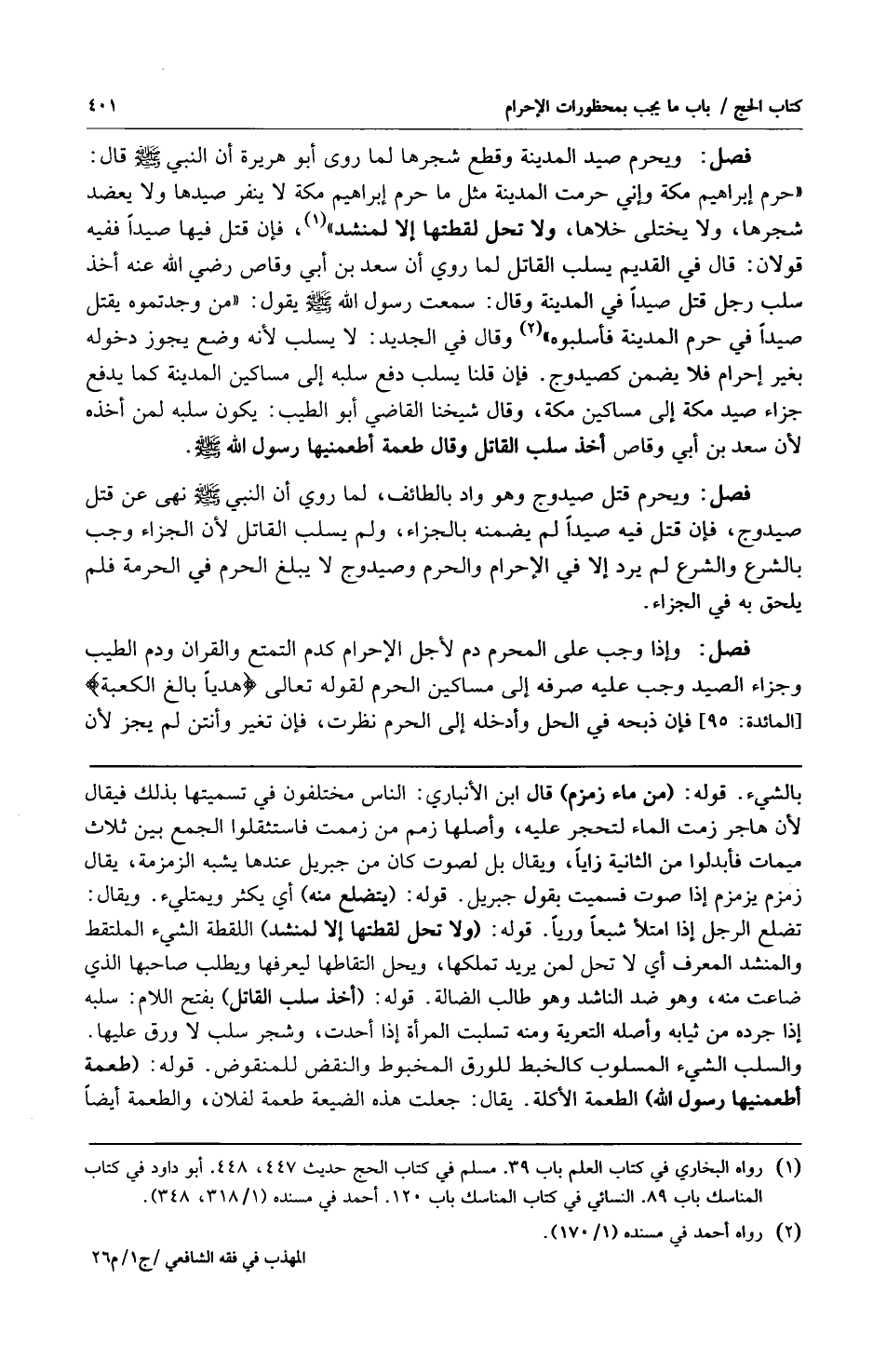 فصل: ويحرم صيد المدينة وقطع شجرها لما روى أبو هريرة أن النبي صلى الله عليه وسلم قال: "حرم إبراهيم مكة وإني حرمت المدينة مثل ما حرم إبراهيم مكة لا ينفر صيدها ولا يعضد شجرها ولا يختلى خلاها ولا تحل لقطتها إلا لمنشد1" فإن قتل فيها صيداً ففيه قولان: قال في القديم يسلب القاتل لما روي أن سعد بن أبي وقاص رضي الله عنه أخذ سلب رجل قتل صيداً في المدينة وقال: سمعت رسول الله صلى الله عليه وسلم يقول: "من وجدتموه يقتل صيداً في حرم المدينة فأسلبوه2" وقال في الجديد: لا يسلب لأنه وضع يجوز دخوله بغير إحرام فلا يضمن كصيدوج فإن قلنا يسلب دفع سلبه إلى مساكين المدينة كما يدفع جزاء صيد مكة إلى مساكين مكة وقال شيخنا القاضي أبو الطيب: يكون سلبه لمن أخذه لأن سعد بن أبي وقاص أخذ سلب القاتل وقال طعمة أطعمنيها رسول الله صلى الله عليه وسلم.