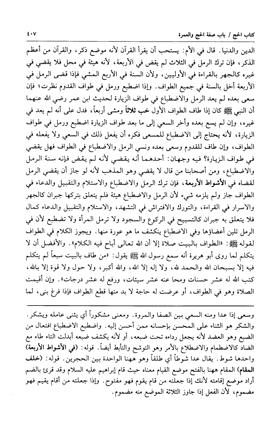 الدين والدنيا قال في الأم: يستحب أن يقرأ القرآن لأنه موضع ذكر والقرآن من أعظم الذكر فإن ترك الرمل في الثلاث لم يقض في الأربعة لأنه هيئة في محل فلا يقضي في غيره كالجهر بالقراءة في الأوليين ولأن السنة في الأربع المشي فإذا قضى الرمل في الأربعة أخل بالسنة في جميع الطواف وإذا اضطبع ورمل في طواف القدوم نظرت فإن سعى بعده لم يعد الرمل والاضطباع في طواف الزيارة لحديث ابن عمر رضي الله عنهما أن النبي صلى الله عليه وسلم كان إذا طاف الطواف الأول خب ثلاثاً ومشى أربعاً فدل على أنه لم يعد في غيره وإن لم يسع بعده وأخر السعي إلى ما بعد طواف الزيارة اضطبع ورمل في طواف الزيارة لأنه يحتاج إلى الاضطباع للمسعى فكره أن يفعل ذلك في السعي ولا يفعله في الطواف وإن طاف للقدوم وسعى بعده ونسي الرمل والاضطباع في الطواف فهل يقضي في طواف الزيارة؟ فيه وجهان: أحدهما أنه يقضي لأنه لم يقض فإنه سنة الرمل والاضطباع ومن أصحابنا من قال لا يقضي وهو المذهب لأنه لو جاز أن يقضي الرمل لقضاه في الأشواط الأربعة فإن ترك الرمل والاضطباع والاستلام والتقبيل والدعاء في الطواف جاز ولم يلزمه شيء لأن الرمل والاضطباع هيئة فلم يتعلق بتركها جبران كالجهر والاسرار في القراءة والتورك والافتراش في التشهد والاستلام والتقبيل والدعاء كمال فلا يتعلق به جبران كالتسبيح في الركوع والسجود ولا ترمل المرأة ولا تضطبع لأن في الرمل تلين أعضاؤها وفي الاضطباع ينكشف ما هو عورة منها ويجوز الكلام في الطواف لقوله صلى الله عليه وسلم: "الطواف بالبيت صلاة إلا أن الله تعالى أباح فيه الكلام" والأفضل أن لا يتكلم لما روى أبو هريرة أنه سمع رسول الله صلى الله عليه وسلم يقول: "من طاف بالبيت سبعاً لم يتكلم فيه إلا بسبحان الله والحمد لله ولا إله إلا الله والله أكبر ولا حول ولا قوة إلا بالله كتب الله له عشر حسنات ومحا عنه عشر سيئات ورفع له عشر درجات" وإن أقيمت الصلاة وهو في الطواف أو عرضت له حاجة لا بد منها قطع الطواف فإذا فرغ بنى لما