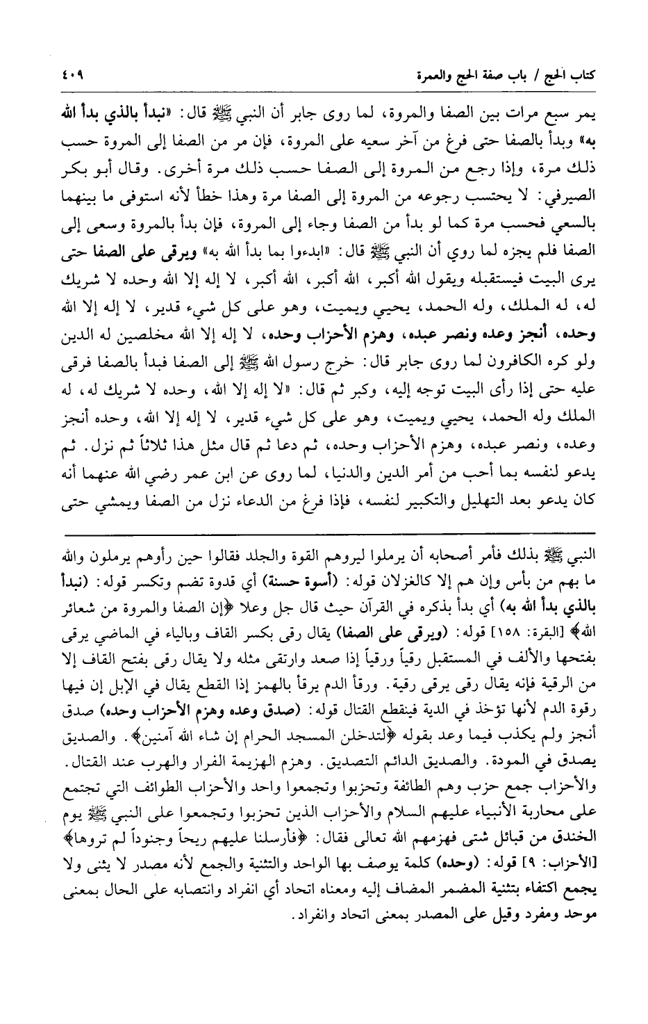 يمر سبع مرات بين الصفا والمروة لما روى جابر أن النبي صلى الله عليه وسلم قال: "نبدأ بالذي بدأ الله به" وبدأ بالصفا حتى فرغ من آخر سعيه على المروة فإن مر من الصفا إلى المروة حسب ذلك مرة وإذا رجع من المروة إلى الصفا حسب ذلك مرة أخرى وقال أبو بكر الصيرفي: لا يحتسب رجوعه من المروة إلى الصفا مرة وهذا خطأ لأنه استوفى ما بينهما بالسعي فحسب مرة كما لو بدأ من الصفا وجاء إلى المروة فإن بدأ بالمروة وسعى إلى الصفا فلم يجزه لما روي أن النبي صلى الله عليه وسلم قال: "ابدءوا بما بدأ الله به" ويرقى على الصفا حتى يرى البيت فيستقبله ويقول الله أكبر الله أكبر الله أكبر لا إله إلا الله وحده لا شريك له له الملك وله الحمد يحيي ويميت وهو على كل شيء قدير لا إله إلا الله وحده أنجز وعده ونصر عبده وهزم الأحزاب وحده لا إله إلا الله مخلصين له الدين ولو كره الكافرون لما روى جابر قال: خرج رسول الله صلى الله عليه وسلم إلى الصفا فبدأ بالصفا فرقى عليه حتى إذا رأى البيت توجه إليه وكبر ثم قال: لا إله إلا الله وحده لا شريك له له الملك وله الحمد يحيي ويميت وهو على كل شيء قدير لا إله إلا الله وحده أنجز وعده ونصر عبده وهزم الأحزاب وحده ثم دعا ثم قال مثل هذا ثلاثاً ثم نزل ثم يدعو لنفسه بما أحب من أمر الدين والدنيا لما روى عن ابن عمر رضي الله عنهما أنه كان يدعو بعد التهليل والتكبير لنفسه فإذا فرغ من الدعاء نزل من الصفا ويمشي حتى
