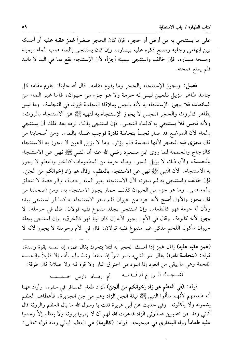فصل: ويجوز الإستنجاء بالحجر وما يقوم مقامه قال أصحابنا: يقوم مقامه كل جامد طاهر مزيل للعين ليس له حرمة ولا هو جزء من حيوان فأما غير الماء من المائعات فلا يجوز الإستنجاء به لأنه ينجس بملاقاة النجاسة فيزيد في النجاسة وما ليس بطاهر كالروث والحجر النجس لا يجوز الإستنجاء به لنهيه صلى الله عليه وسلم عن الاستنجاء بالروث ولأنه نجس فلا يستنجي به كالماء النجس فإن استنجى بذلك لزمه بعد ذلك أن يستنجي بالماء لأن الموضع قد صار نجساً بنجاسة نادرة فوجب غسله بالماء ومن أصحابنا من قال يجزي فيه الحجر لأنها نجاسة فلم يؤثر وما لا يزيل العين لا يجوز به الاستنجاء كالزجاج والحممة لما روى ابن مسعود رضي الله عنه أن النبي صلى الله عليه وسلم نهى عن الإستنجاء بالحممة ولأن ذلك لا يزيل النجو وما له حرمة من المطعومات كالخبز والعظم لا يجوز به الاستنجاء لأن النبي صلى الله عليه وسلم نهى عن الإستنجاء بالعظم وقال: "هو زاد إخوانكم من الجن" فإن خالف واستنجى به لم يجزئه لأن الاستنجاء بغير الماء رخصة والرخصة لا تتعلق بالمعاصي وما هو جزء من الحيوان كذنب حمار يجوز الإستنجاء به ومن أصحابنا من قال يجوز والأول أصح لأنه جزء من حيوان فلم يجز الإستنجاء به كما لو استنجى بيده ولأن له حرمة فهو كالطعام وإن استنجى بجلد مدبوغ ففيه قولان: قال في حرملة: لا يجوز لأنه كالرمة وقال في الأم: يجوز لأنه إن كان ليناً فهو كالخرق وإن استنجى بجلد حيوان مأكول اللحم مذكى غير مدبوغ ففيه قولان: قال في الأم: وحرملة لا يجوز لأنه لا