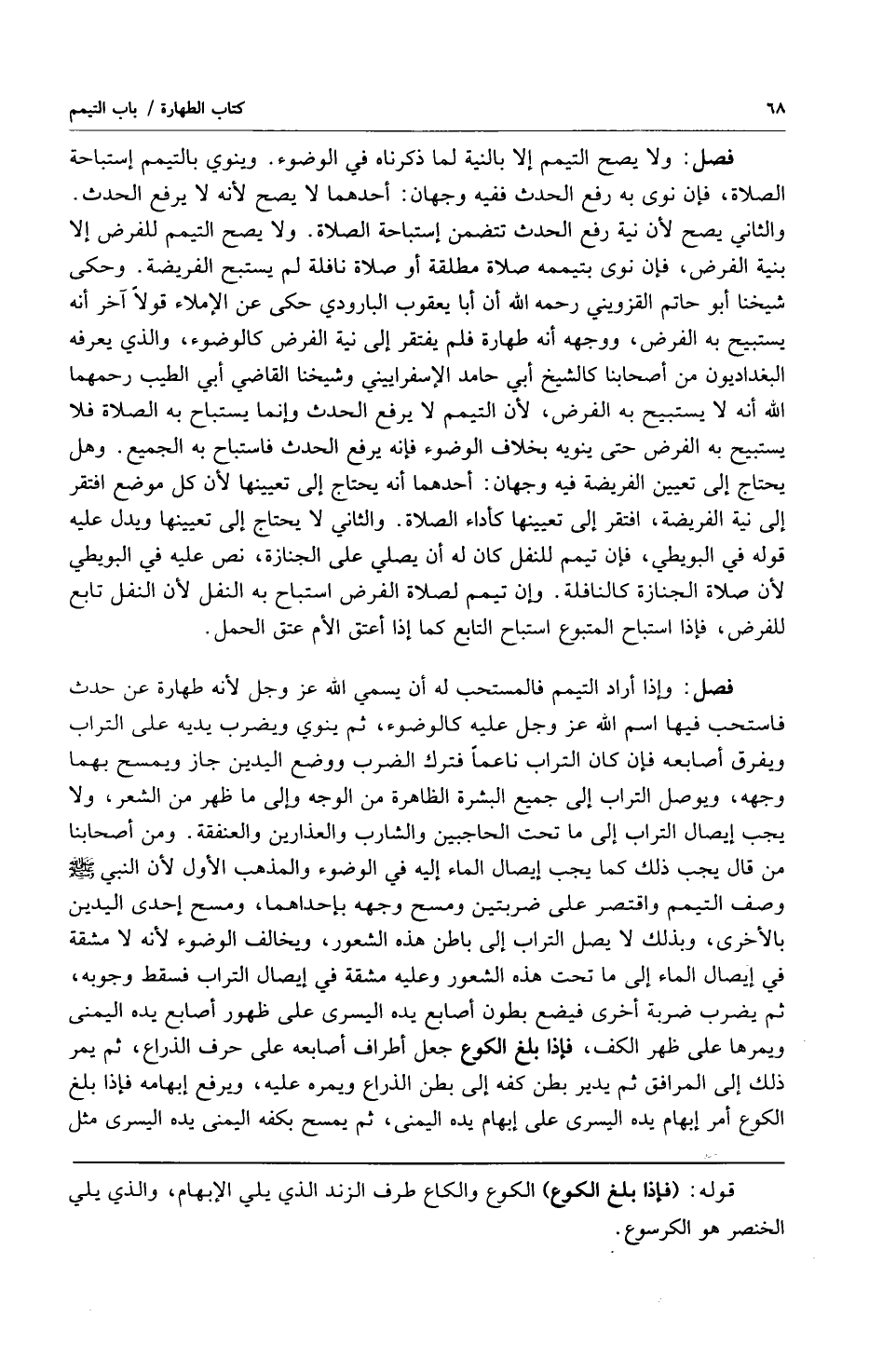 فصل: وإذا أراد التيمم فالمستحب له أن يسمي الله عز وجل لأنه طهارة عن حدث فاستحب فيها اسم الله عز وجل عليه كالوضوء ثم ينوي ويضرب يديه على التراب ويفرق أصابعه فإن كان التراب ناعماً فترك الضرب ووضع اليدين جاز ويمسح بهما وجهه ويوصل التراب إلى جميع البشرة الظاهرة من الوجه وإلى ما ظهر من الشعر ولا يجب إيصال التراب إلى ما تحت الحاجبين والشارب والعذارين والعنفقة ومن أصحابنا من قال يجب ذلك كما يجب إيصال الماء إليه في الوضوء والمذهب الأول لأن النبي صلى الله عليه وسلم وصف التيمم واقتصر على ضربتين ومسح وجهه بإحداهما ومسح إحدى اليدين بالأخرى وبذلك لا يصل التراب إلى باطن هذه الشعور ويخالف الوضوء لأنه لا مشقة في إيصال الماء إلى ما تحت هذه الشعور وعليه مشقة في إيصال التراب فسقط وجوبه ثم يضرب ضربة أخرى فيضع بطون أصابع يده اليسرى على ظهور أصابع يده اليمنى ويمرها على ظهر الكف فإذا بلغ الكوع جعل أطراف أصابعه على حرف الذراع ثم يمر ذلك إلى المرافق ثم يدير بطن كفه إلى بطن الذراع ويمره عليه ويرفع إبهامه فإذا بلغ الكوع أمر إبهام يده اليسرى على إبهام يده اليمنى ثم يمسح بكفه اليمنى يده اليسرى مثل