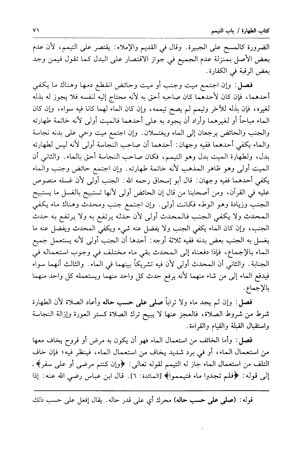 فصل: وإن اجتمع ميت وجنب أو ميت وحائض انقطع دمها وهناك ما يكفي أحدهما فإن كان لأحدهما كان صاحبه أحق به لأنه محتاج إليه لنفسه فلا يجوز له بذله لغيره فإن بذله للآخر وتيمم لم يصح تيممه وإن كان الماء لهما كانا فيه سواء وإن كان الماء مباحاً أو لغيرهما وأراد أن يجود على أحدهما فالميت أولى لأنه خاتمة طهارته والجنب والحائض يرجعان إلى الماء ويغتسلان وإن اجتمع ميت وحي على بدنه نجاسة والماء يكفي أحدهما ففيه وجهان: أحدهما أن صاحب النجاسة أولى لأنه ليس لطهارته بدل ولطهارة الميت بدل وهو التيمم فكان صاحب النجاسة أحق بالماء والثاني أن الميت أولى وهو ظاهر المذهب لأنه خاتمة طهارته وإن اجتمع حائض وجنب والماء يكفي أحدهما ففيه وجهان: قال أبو إسحاق رحمه الله: الجنب أولى لأن غسله منصوص عليه في القرآن ومن أصحابنا من قال إن الحائض أولى لأنها تستبيح بالغسل ما يستبيح الجنب وزيادة وهو الوطء فكانت أولى وإن اجتمع جنب ومحدث وهناك ماء يكفي المحدث ولا يكفي الجنب فالمحدث أولى لأن حدثه يرتفع به ولا يرتفع به حدث الجنب وإن كان الماء يكفي الجنب ولا يفضل عنه شيء ويكفي المحدث ويفضل عنه ما يغسل به الجنب بعض بدنه ففيه ثلاثة أوجه: أحدها أن الجنب أولى لأنه يستعمل جميع الماء بالإجماع فإذا دفعناه إلى المحدث بقي ماء مختلف في وجوب استعماله في الجنابة والثاني أن المحدث أولى لأن فيه تشريكاً بينهما في الماء والثالث أنهما سواء فيدفع الماء إلى من شاء منهما لأنه يرفع حدث كل واحد منهما ويستعمله كل واحد منهما بالإجماع.