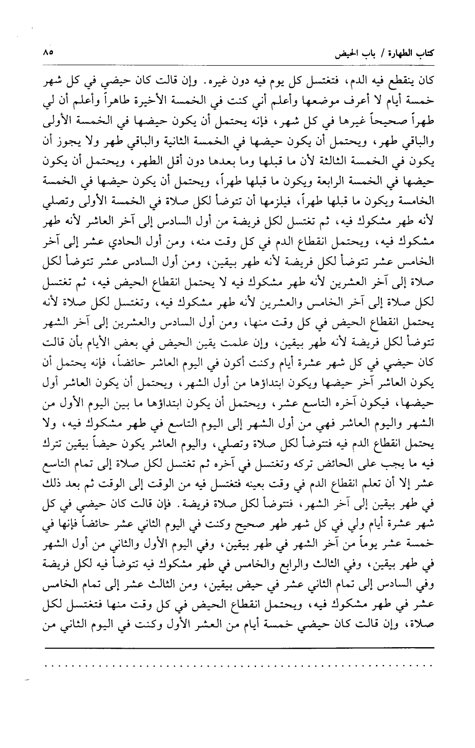 كان ينقطع فيه الدم فتغتسل كل يوم فيه دون غيره وإن قالت كان حيضي في كل شهر خمسة أيام لا أعرف موضعها وأعلم أني كنت في الخمسة الأخيرة طاهراً وأعلم أن لي طهراً صحيحاً غيرها في كل شهر فإنه يحتمل أن يكون حيضها في الخمسة الأولى والباقي طهر ويحتمل أن يكون حيضها في الخمسة الثانية والباقي طهر ولا يجوز أن يكون في الخمسة الثالثة لأن ما قبلها وما بعدها دون أقل الطهر ويحتمل أن يكون حيضها في الخمسة الرابعة ويكون ما قبلها طهراً ويحتمل أن يكون حيضها في الخمسة الخامسة ويكون ما قبلها طهراً فلزمها أن تتوضأ لكل صلاة في الخمسة الأولى وتصلي لأنه طهر مشكوك فيه ثم تغتسل لكل فريضة من أول السادس إلى آخر العاشر لأنه طهر مشكوك فيه ويحتمل انقطاع الدم في كل وقت منه ومن أول الحادي عشر إلى آخر الخامس عشر تتوضأ لكل فريضة لأنه طهر بيقين ومن أول السادس عشر تتوضأ لكل صلاة إلى آخر العشرين لأنه طهر مشكوك فيه لا يحتمل انقطاع الحيض فيه ثم تغتسل لكل صلاة إلى آخر الخامس والعشرين لأنه طهر مشكوك فيه وتغتسل لكل صلاة لأنه يحتمل انقطاع الحيض في كل وقت منها ومن أول السادس والعشرين إلى آخر الشهر تتوضأ لكل فريضة لأنه طهر بيقين وإن علمت يقين الحيض في بعض الأيام بأن قالت كان حيضي في كل شهر عشرة أيام وكنت أكون في اليوم العاشر حائضاً فإنه يحتمل أن يكون العاشر آخر حيضها ويكون ابتداؤها من أول الشهر ويحتمل أن يكون العاشر أول حيضها فيكون آخره التاسع عشر ويحتمل أن يكون ابتداؤها ما بين اليوم الأول من الشهر واليوم العاشر فهي من أول الشهر إلى اليوم التاسع في طهر مشكوك فيه ولا يحتمل انقطاع الدم فيه فتتوضأ لكل صلاة وتصلي واليوم العاشر يكون حيضاً بيقين تترك فيه ما يجب على الحائض تركه وتغتسل في آخره ثم تغتسل لكل صلاة إلى تمام التاسع عشر إلا أن تعلم انقطاع الدم في وقت بعينه فتغسل فيه من الوقت إلى الوقت ثم بعد ذلك في طهر بيقين إلى آخر الشهر فتتوضأ لكل صلاة فريضة فإن قالت كان حيضي في كل شهر عشرة أيام ولي في كل شهر طهر صحيح وكنت في اليوم الثاني عشر حائضاً فإنها في خمسة عشر يوماً من آخر الشهر في طهر بيقين وفي اليوم الأول والثاني من أول الشهر في طهر بيقين وفي الثالث والرابع والخامس في طهر مشكوك فيه تتوضأ فيه لكل فريضة وفي السادس إلى تمام الثاني عشر في حيض بيقين ومن الثالث عشر إلى تمام الخامس عشر في طهر مشكوك فيه ويحتمل انقطاع الحيض في كل وقت منها فتغتسل لكل صلاة وإن قالت كان حيضي خمسة أيام من العشر الأول وكنت في اليوم الثاني من