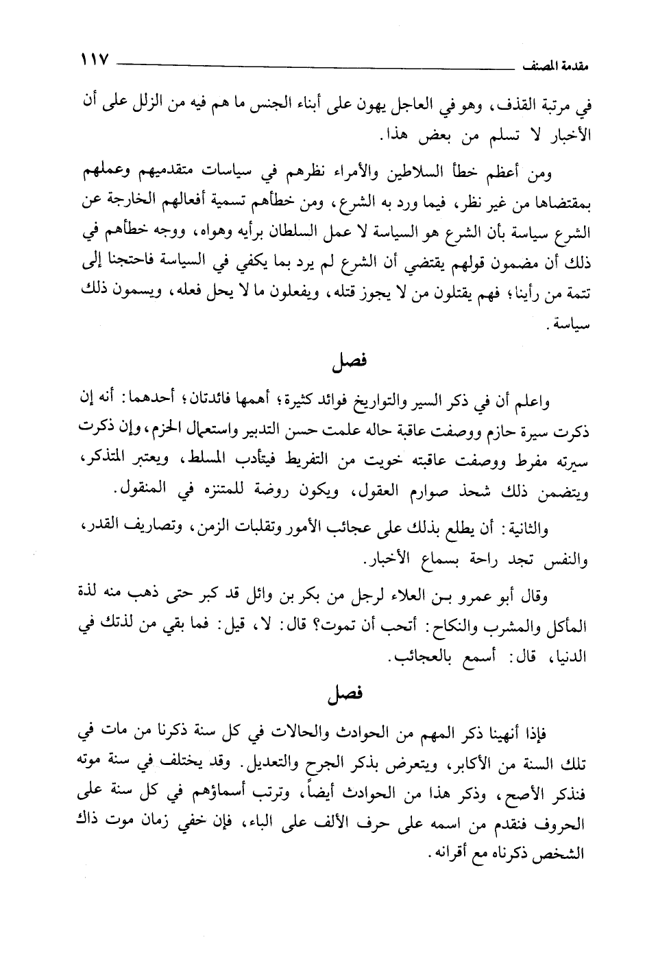واعلم أَن فِي ذكر السير والتواريخ فوائد كثيرة، أهمها فائدتان، أحدهما: أَنَّهُ إِن ذكرت سيرة حازم ووصفت عاقبة حاله علمت حسن التدبير واستعمال الحزم، وإن ذكرت سيرته مفرط ووصفت عاقبته خويت من التفريط فيتأدب المسلط، ويعتبر المتذكر، ويتضمن ذَلِكَ شحذ صوارم العقول، ويكون روضة للمتنزه فِي المنقول.