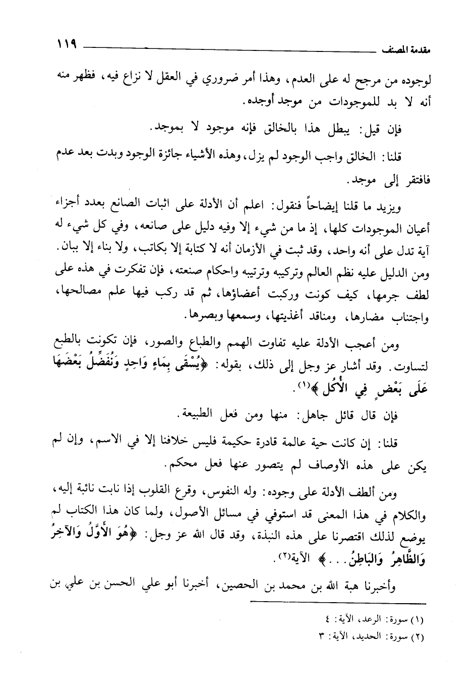 ومن ألطف الأدلة عَلَى وجوده: وَلَهُ النفوس، وقرع القلوب إِذَا نابت نائبة إِلَيْهِ، والكلام فِي هَذَا المعنى قَدِ استوفي فِي مسائل الأصول، ولما كَانَ هَذَا الكتاب لَمْ يوضع لِذَلِكَ اقتصرنا عَلَى هذه النبذة، وَقَدْ قَالَ اللَّه عَزَّ وَجَلَّ: هُوَ الْأَوَّلُ وَالْآخِرُ وَالظَّاهِرُ وَالْباطِنُ ... 57: 3 الآية [2] .