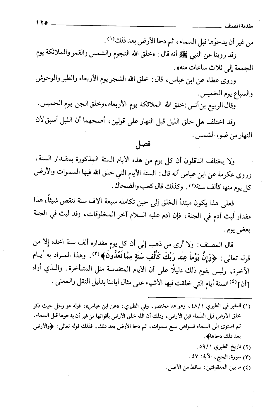 قَالَ المصنف: ولا أرى من ذهب إِلَى أَن كُل يَوْم مقداره ألف سَنَة أخذه إلا من قَوْله تَعَالَى: وَإِنَّ يَوْماً عِنْدَ رَبِّكَ كَأَلْفِ سَنَةٍ مِمَّا تَعُدُّونَ 22: 47 [3] . وَهَذَا المراد بِهِ أَيَّام الآخرة، وليس يقوم ذَلِكَ دليلا عَلَى أَن الأيام المتقدمة مثل المتأخرة. والذي أراه [أَن] [4] الستة أَيَّام الَّتِي خلقت فيها الأشياء عَلَى مثال أيامنا بدليل النقل والمعنى.