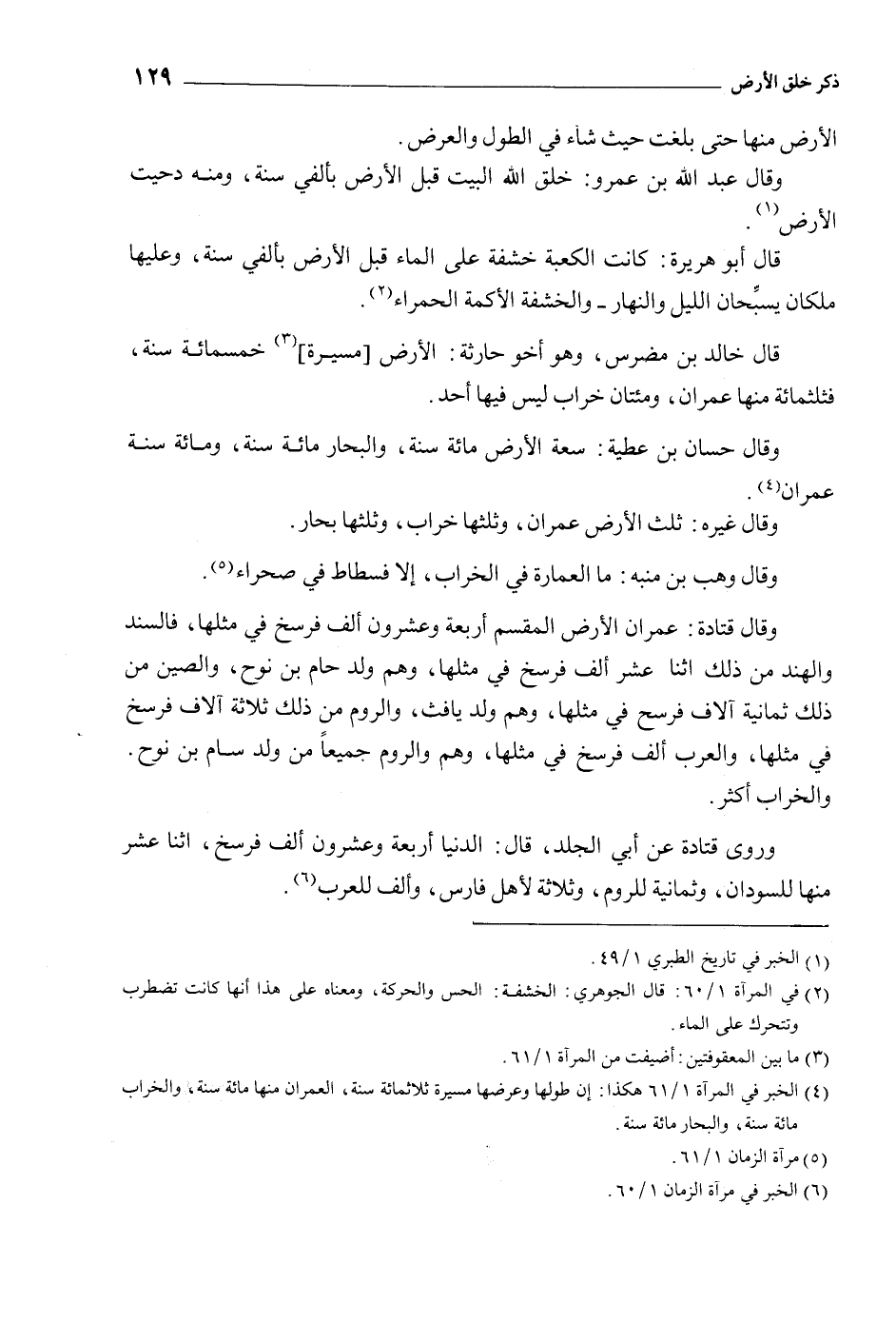 [4] الخبر في المرآة 1/ 61 هكذا: إن طولها وعرضها مسيرة ثلاثمائة سنة، العمران منها مائة سنة، والخراب مائة سنة، والبحار مائة سنة.