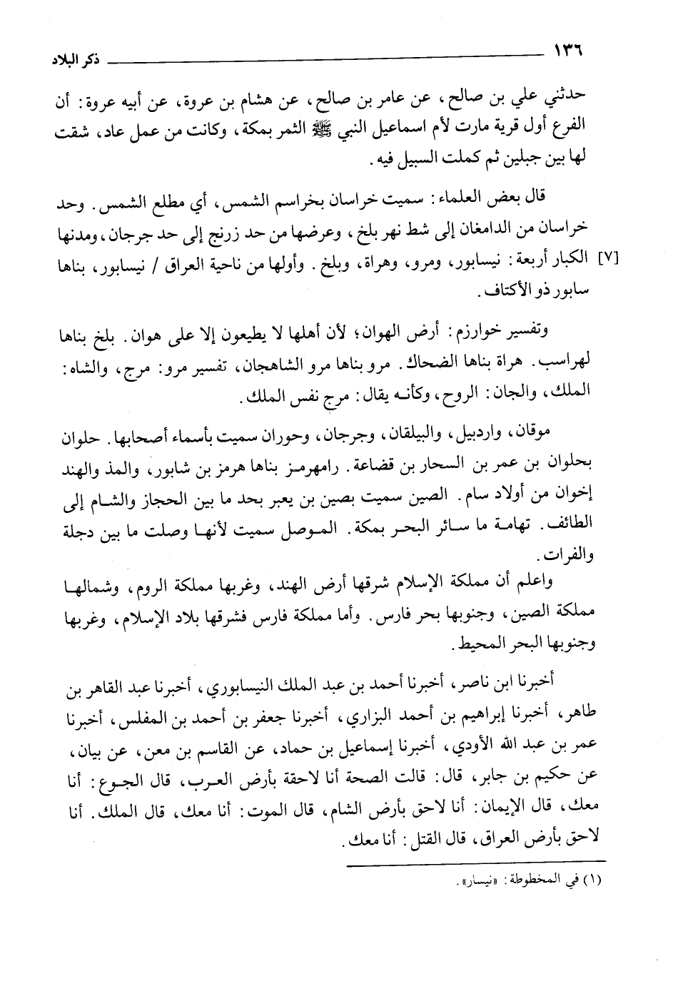 وتفسير خوارزم: أرض الهوان، لأن أهلها لا يطيعون إلى عَلَى هوان. بلخ بناها لهراسب. هراة بناها الضَّحَّاك. مرو بناها مرو الشاهجان، تفسير مرو: مرج، والشاه: