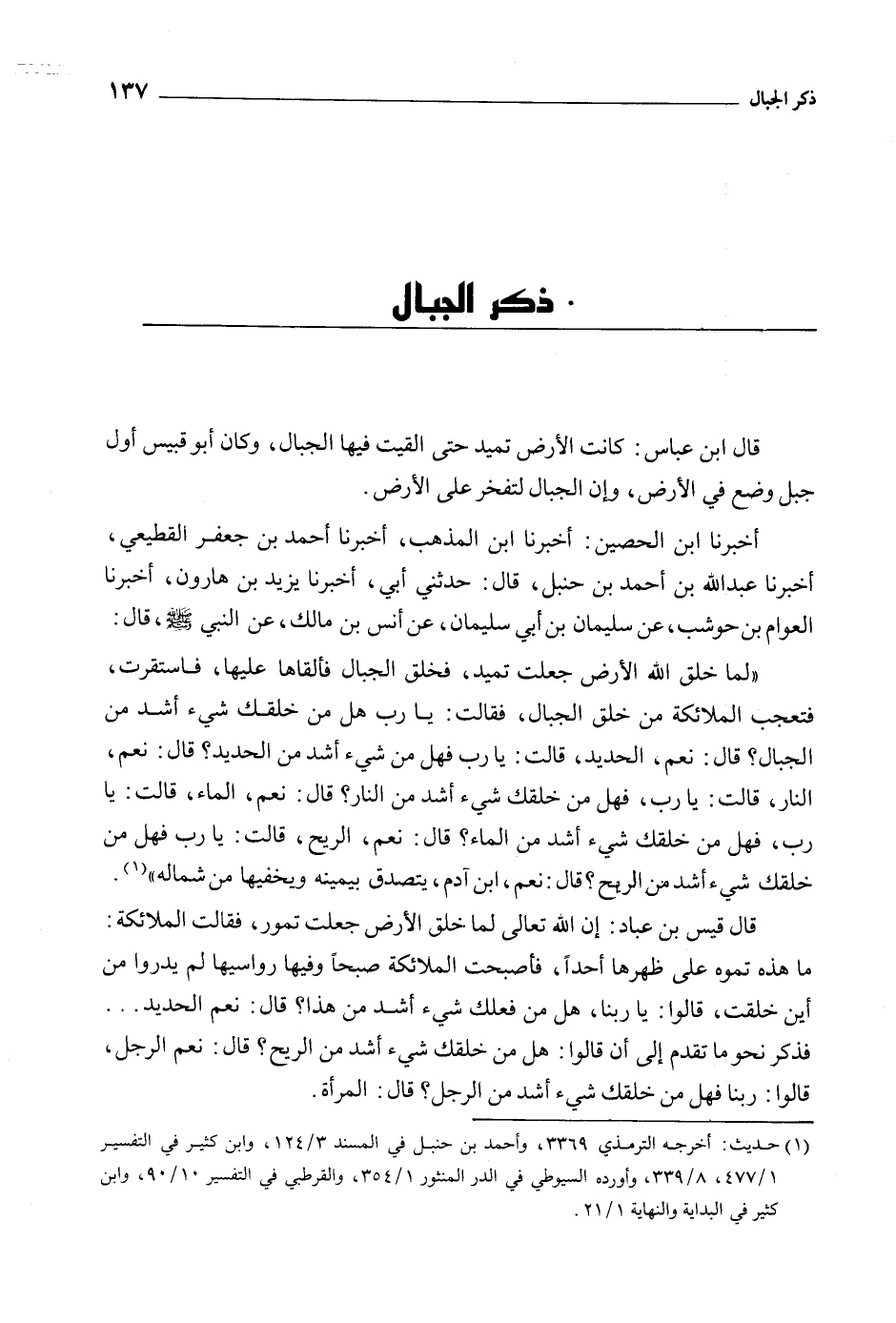 مَا هذه تموه عَلَى ظهرها أحدا، فأصبحت الْمَلائِكَة صبحا وفيها رواسيها لَمْ يدروا من أين خلقت، قَالُوا: يا ربنا، هل من فعلك شَيْء أشد من هَذَا؟ قَالَ: نعم الحديد ...