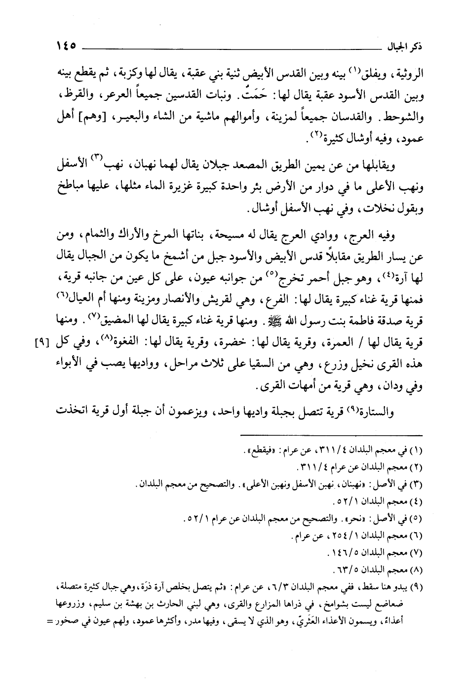 [9] يبدو هنا سقط، ففي معجم البلدان 3/ 6، عن عرام: «ثم يتصل بخلص آرة ذرة، وهي جبال كثيرة متصلة، ضعاضع ليست بشوامخ، في ذراها المزارع والقرى، وهي لبني الحارث بن بهشة بن سليم، وزروعها أعذاء، ويسمون الأعذاء العثريّ، وهو الّذي لا يسقى، وفيها مدر، وأكثرها عمود، ولهم عيون في صخور