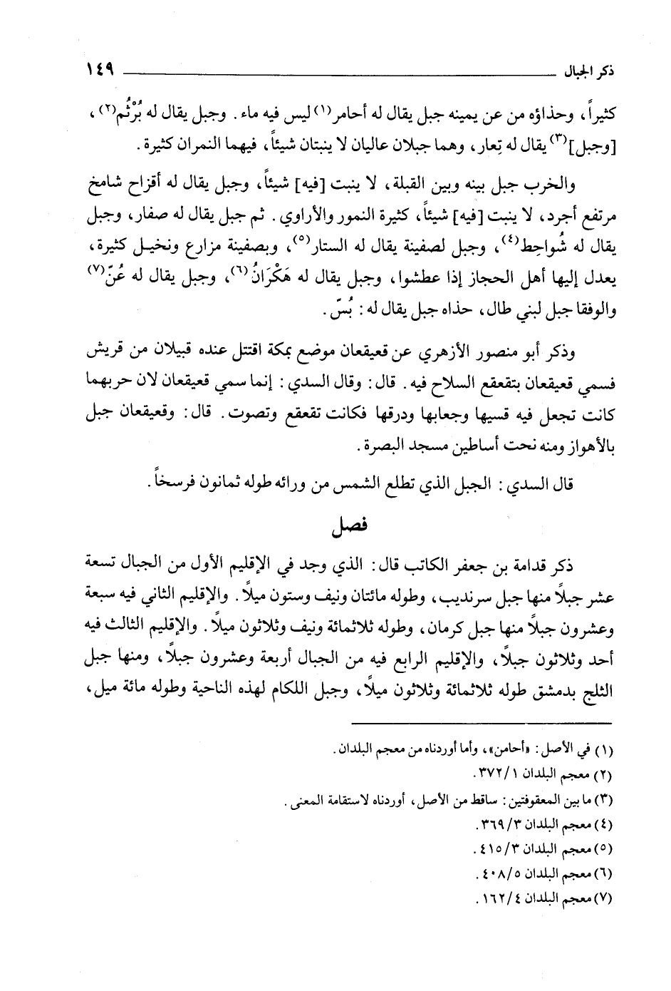 ذكر قدامة بْن جَعْفَر الكاتب قَالَ: الَّذِي وجد فِي الإقليم الأَوَّل من الجبال تسعة عشر جبلا منها جبل سرنديب، وطوله مائتان ونيف وستون ميلا. والإقليم الثَّانِي فِيهِ سبعة وعشرون جبلا منها جبل كرمان، وطوله ثلاثمائة ونيف وثلاثون ميلا. والإقليم الثالث فِيهِ أحد وثلاثون جبلا، والإقليم الرابع فِيهِ من الجبال أربعة وعشرون جبلا، ومنها جبل الثلج بدمشق طوله ثلاثمائة وثلاثون ميلا، وجبل اللكام لهذه الناحية وطوله مائة ميل،