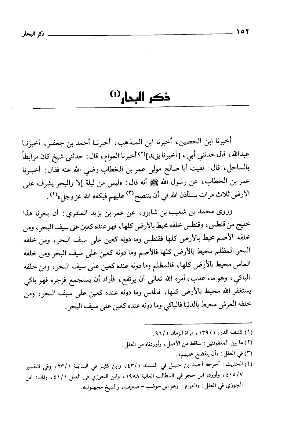 [4] الحديث: أخرجه أحمد بن حنبل في المسند 1/ 43، وابن كثير في البداية 1/ 23، وفي التفسير 7/ 405، وأورده ابن حجر في المطالب العالية 1988، وابن الجوزي في العلل 1/ 41، وقال: ابن الجوزي في العلل: «العوام- وهو ابن حوشب- ضعيف، والشيخ مجهول» .
