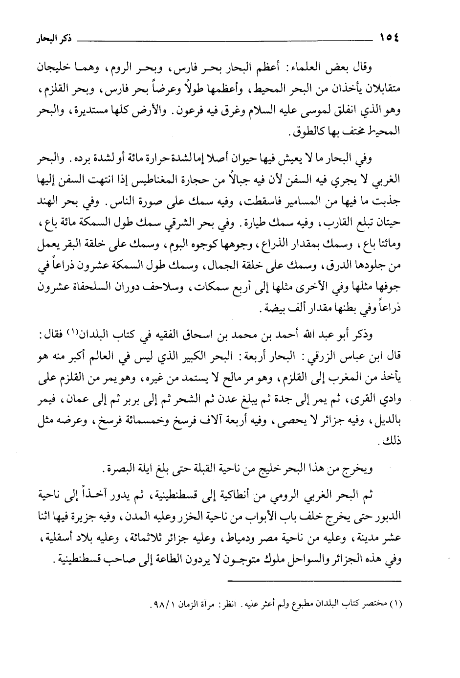 وَقَالَ بَعْض الْعُلَمَاء: أَعْظَم البحار بحر فارس، وبحر الروم، وهما خليجان متقابلان يأخذان من البحر المحيط، وأعظمها طولا وعرضا بحر فارس، وبحر القلزم، وَهُوَ الَّذِي انفلق لموسى عَلَيْهِ السَّلام وغرق فِيهِ فرعون. وَالأَرْض كلها مستديرة، والبحر المحيط مختف بها كالطوق.