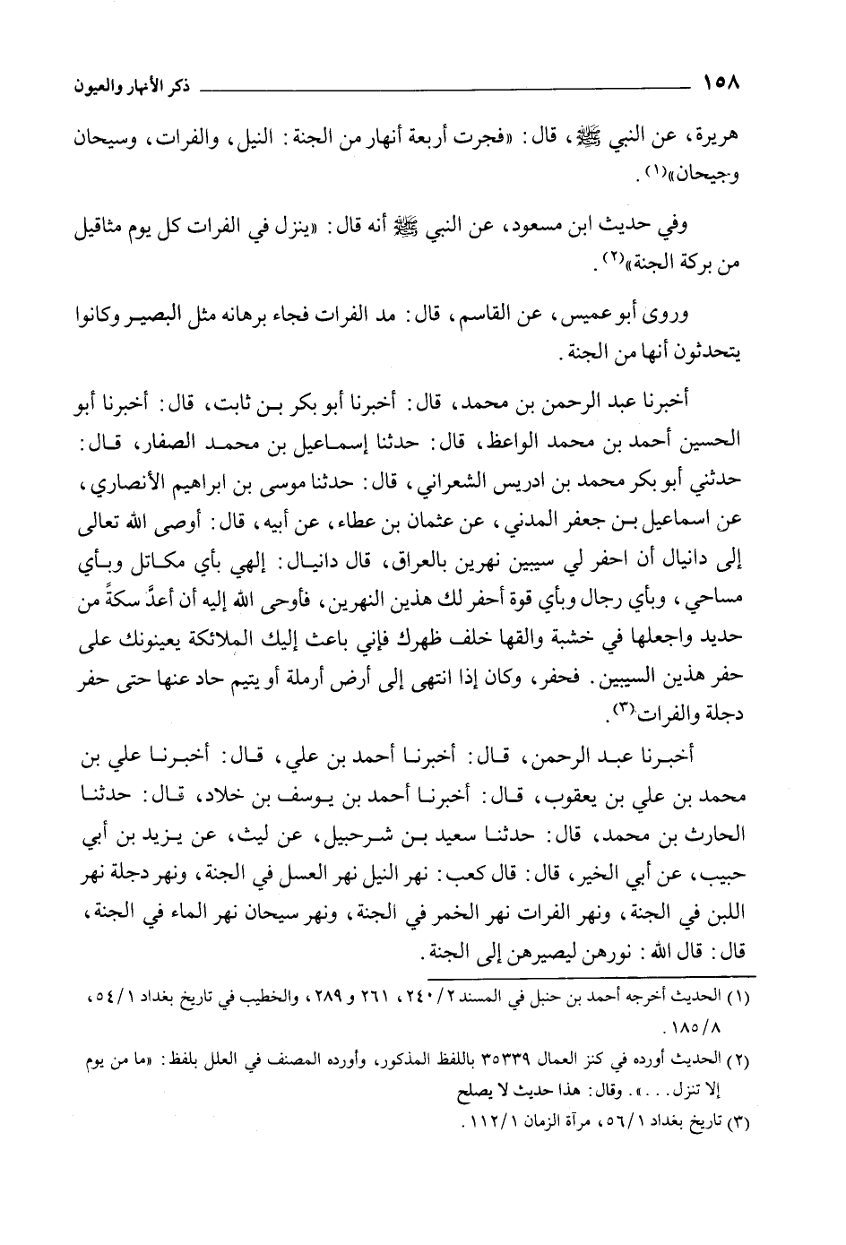هُرَيْرَةَ، عَنِ النَّبِيِّ صَلَّى اللَّهُ عَلَيْهِ وَسَلَّمَ، قَالَ: «فُجِّرَتْ أَرْبَعَةُ أَنْهَارٍ مِنَ الْجَنَّةِ: النِّيلُ، وَالْفُرَاتُ، وَسَيْحَانُ وَجَيْحَانُ» [1] .