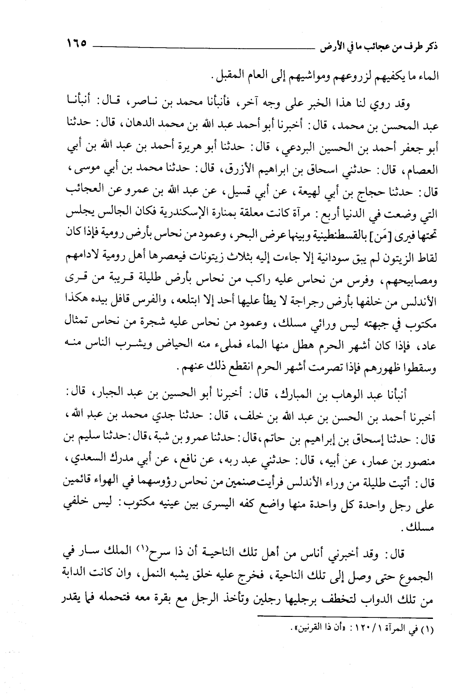 وَقَدْ روي لنا هَذَا الْخَبَر عَلَى وجه آخر، فَأَنْبَأَنَا مُحَمَّدُ بْنُ نَاصِرٍ، قَالَ: أَنْبَأَنَا عَبْدُ الْمُحْسِنِ بْنُ مُحَمَّدٍ، قَالَ: أَخْبَرَنَا أَبُو أَحْمَد عَبْد اللَّهِ بْن مُحَمَّد الدَّهَّانُ، قَالَ: حَدَّثَنَا أَبُو جَعْفَر أَحْمَد بْن الْحُسَيْن الْبَرْدَعِيُّ، قَالَ: حَدَّثَنَا أَبُو هُرَيْرَة أَحْمَد بْن عَبْد اللَّهِ بْن أَبِي الْعِصَامِ، قَالَ: حَدَّثَنِي إِسْحَاقُ بْنُ إِبْرَاهِيمَ الأَزْرَقُ، قَالَ: حَدَّثَنَا مُحَمَّد بْن أَبِي مُوسَى، قَالَ: حَدَّثَنَا حَجَّاجُ بْن أَبِي لَهِيعَةَ، عَن أَبِي قُسَيْلٍ، عَن عَبْد الله بن عمرو عن العجائب التي وُضِعَتْ فِي الدُّنْيَا أَرْبَعُ: مِرْآَةٌ كَانَتْ مُعَلَّقَةً بِمَنَارَةِ الإِسْكَنْدَرِيَّةِ فَكَانَ الْجَالِسُ يَجْلِسُ تَحْتَهَا فَيَرَى [مَنْ] بِالْقُسْطَنْطِينِيَّةِ وَبَيْنَهَا عَرْضُ الْبَحْرِ، وَعَمُودٌ مِنْ نُحَاسٍ بِأَرْضِ رُومِيَّةَ فَإِذَا كَانَ لِقَاطُ الزَّيْتُونِ لم يبق سودانية إلا جاءت إليه بِثَلاثِ زَيْتُونَاتٍ فَيَعْصِرُهَا أَهْلُ رُومِيَّةَ لإِدَامِهِمْ وَمَصَابِيحِهِمْ، وَفَرَسٌ مُنْ نُحَاسٍ عَلَيْهِ رَاكِبٌ مِنْ نُحَاسٍ بأرض طليلة قَرِيبَةٌ مِنْ قُرَى الأَنْدَلُسِ مِنْ خَلْفِهَا بِأَرْضِ رجراجة لا يَطَأُ عَلَيْهَا أَحَدٌ إِلا ابْتَلَعَهُ، وَالْفَرَسُ قَافِلٌ بِيَدِهِ هَكَذَا مَكْتُوبٌ فِي جَبْهَتِهِ لَيْسَ وَرَائِي مَسْلَكٌ، وَعَمُودٌ مِنْ نُحَاسٍ عَلَيْهِ شَجَرَةٌ مِنْ نُحَاسٍ تَمْثَالُ عَادٍ، فَإِذَا كَانَ أَشْهُرُ الْحُرُمِ هَطَلَ مِنْهَا الْمَاءُ فَمُلِئَ مِنْهُ الْحِيَاضُ ويشرب الناس منه وسقطوا ظُهُورَهُمْ فَإِذَا تَصَرَّمَتْ أَشْهُرُ الْحُرُمِ انْقَطَعَ ذَلِكَ عنهم.