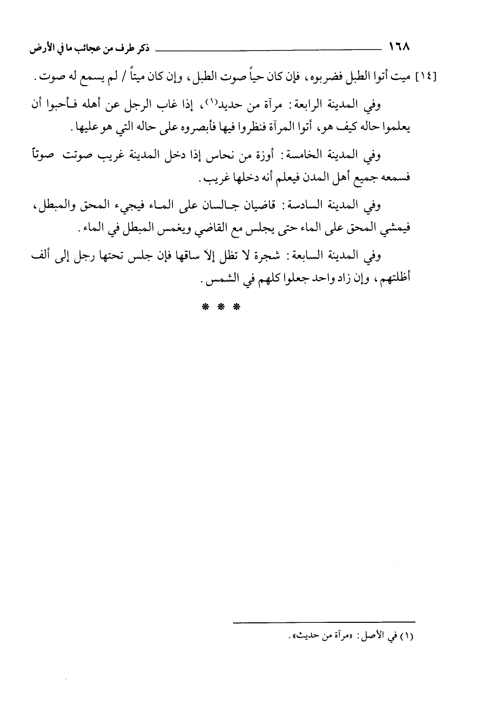 وَفِي المدينة الرابعة: مرآة من حديد [1] ، إِذَا غاب الرجل عَن أهله فأحبوا أَن يعلموا حاله كَيْفَ هُوَ، أتوا المرآة فنظروا فِيهَا فأبصروه عَلَى حاله الَّتِي هُوَ عَلَيْهَا.