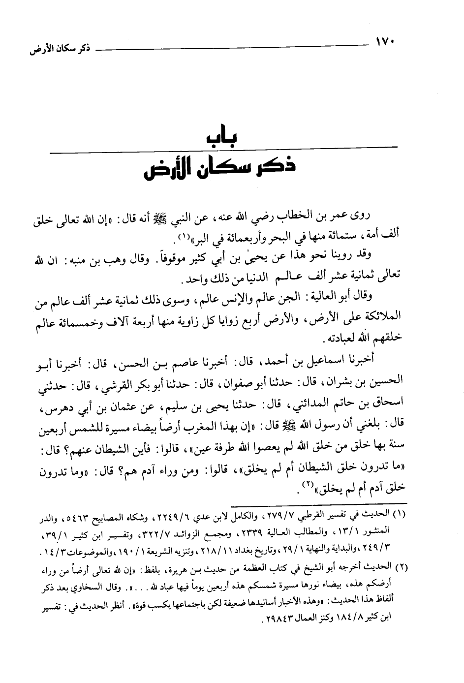[2] الحديث أخرجه أبو الشيخ في كتاب العظمة من حديث بن هريرة، بلفظ: «إن للَّه تعالى أرضا من وراء أرضكم هذه، بيضاء نورها مسيرة شمسكم هذه أربعين يوما فيها عباد للَّه ... » . وقال السخاوي بعد ذكر ألفاظ هذا الحديث: «وهذه الأخبار أسانيدها ضعيفة لكن باجتماعها يكسب قوة» . انظر الحديث في: تفسير ابن كثير 8/ 184 وكنز العمال 29843.