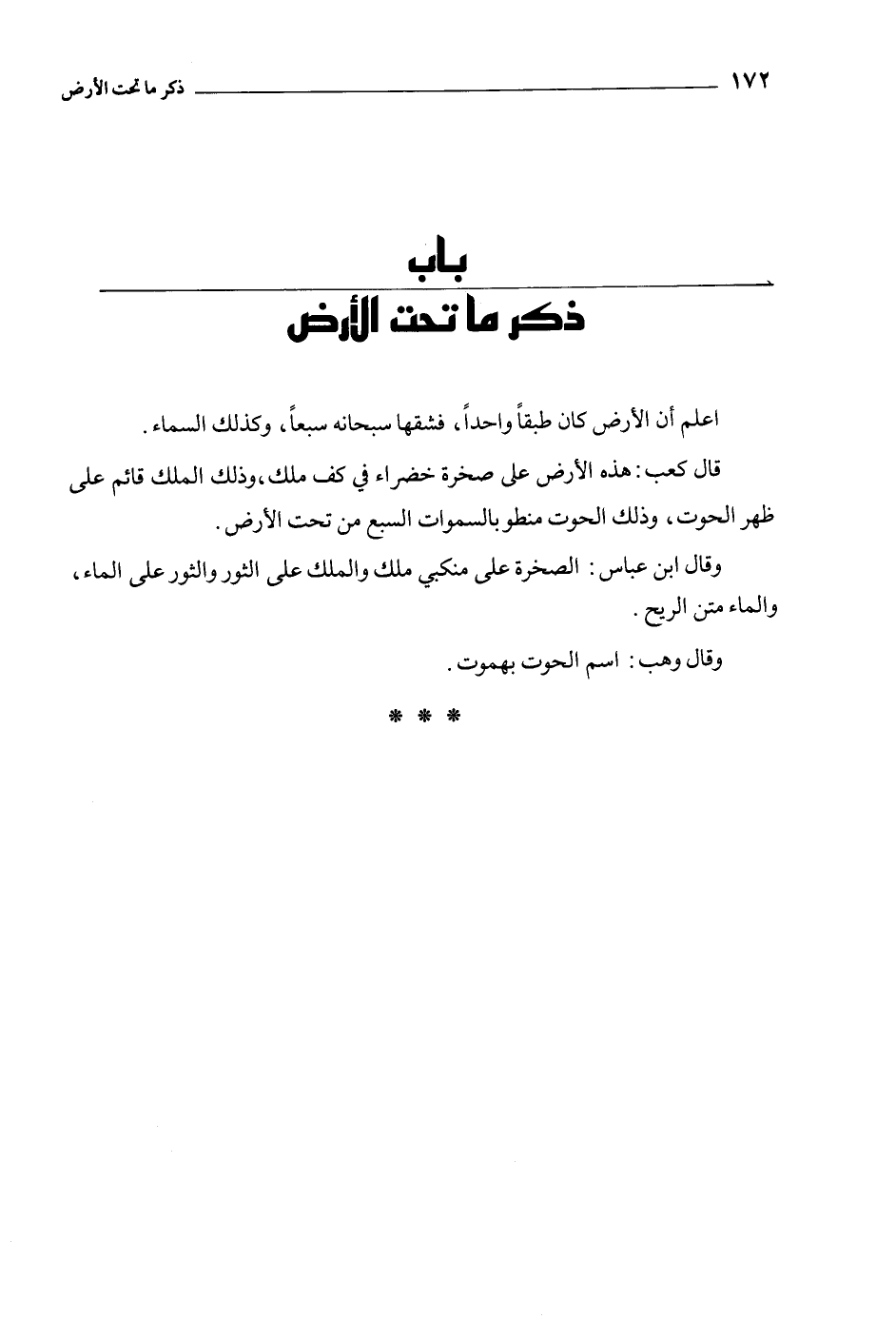 قَالَ كعب: هذه الأَرْض عَلَى صخرة خضراء فِي كف ملك، وَذَلِكَ الْمَلِك قائم على ظهر الحوت، وذلك الحوت منطو بالسماوات السبع من تَحْتَ الأَرْض.