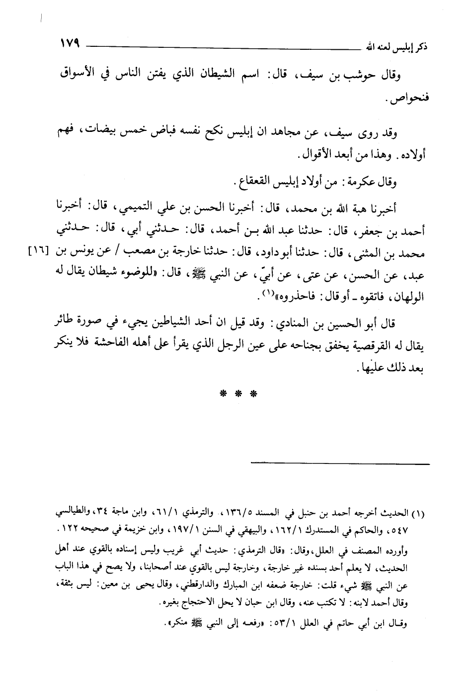 أَخْبَرَنَا هِبَةُ اللَّهِ بْنِ مُحَمَّدٍ، قَالَ: أَخْبَرَنَا الْحَسَنُ بْنُ عَلِيٍّ التَّمِيمِيُّ، قَالَ: أَخْبَرَنَا أَحْمَدُ بْنُ جَعْفَرٍ، قَالَ: حَدَّثَنَا عَبْدُ اللَّه بْن أحمد، قال: حدثني أبي، قال: حدثني محمد بن المثنى، قال: حدثنا أبو دَاوُدُ، قَالَ: حَدَّثَنَا خَارِجَةُ بْنُ مُصْعَبٍ/ عَنْ يونس بن عبد، عَنْ الْحَسَنِ، عَنْ عَتَّى، عَنْ أُبَيٍّ، عَنِ النَّبِيِّ صَلَّى اللَّهُ عَلَيْهِ وَسَلَّمَ، قَالَ: «لِلْوُضُوءِ شَيْطَانُ يُقَالُ لَهُ الْوَلْهَانُ، فَاتَّقُوهُ- أَوْ قَالَ: فَاحْذَرُوهُ» [1] .