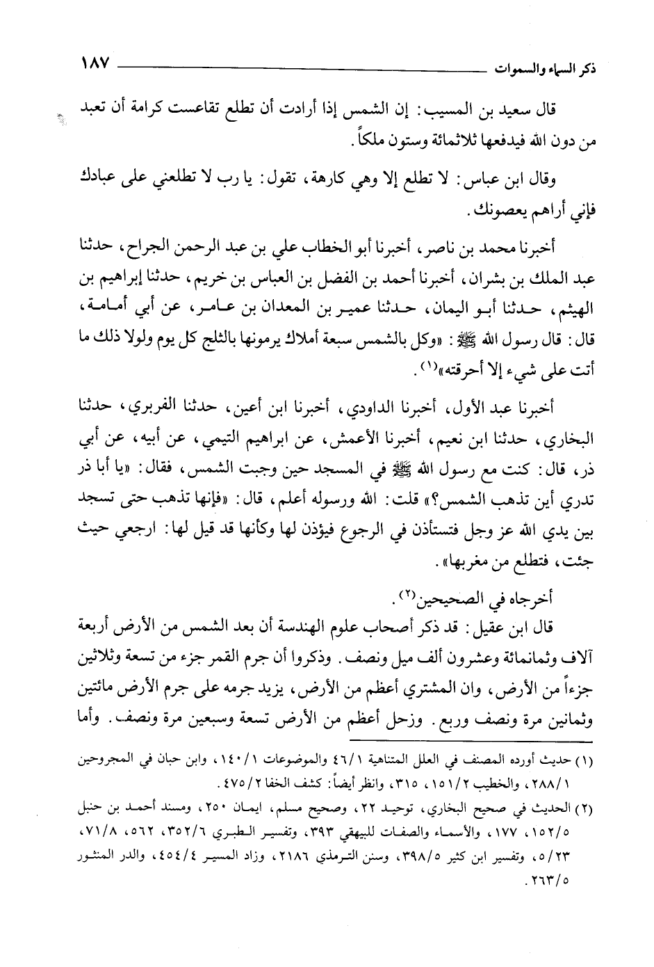 قَالَ ابْن عقيل: قَدْ ذكر أَصْحَاب علوم الهندسة أَن بَعْد الشمس من الأَرْض أربعة آلاف وثمانمائة وعشرون ألف ميل ونصف. وذكروا أَن جرم القمر جزء من تسعة وثلاثين جزءا من الأَرْض، وأن المشتري أَعْظَم من الأَرْض، يَزِيد جرمه عَلَى جرم الأَرْض مائتين وثمانين مرة ونصف وربع. وزحل أَعْظَم من الأَرْض تسعة وسبعين مرة ونصف. وأما