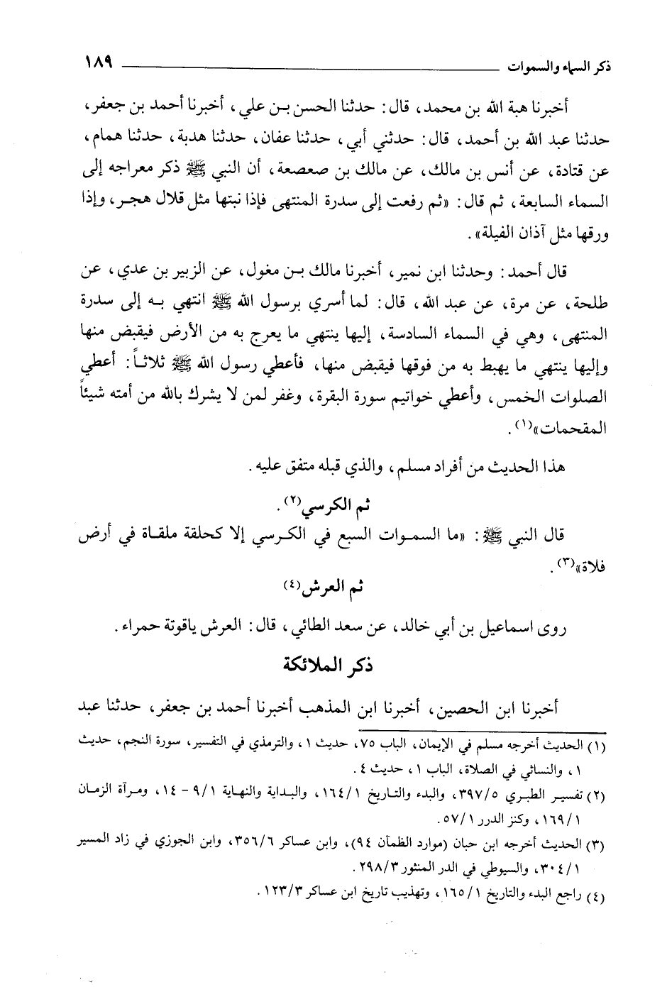 أَخْبَرَنَا هِبَةُ اللَّهِ بْنِ مُحَمَّدٍ، قَالَ: حَدَّثَنَا الحسن بْنُ عَلِيٍّ، أَخْبَرَنَا أَحْمَدُ بْنُ جَعْفَرٍ، حَدَّثَنَا عَبْدُ اللَّهِ بن أحمد، قال: حدثني أَبِي، حَدَّثَنَا عَفَّانُ، حَدَّثَنَا هُدْبَةَ، حَدَّثَنَا هَمَّامُ، عن قتادة، عن أنس بن مالك، عن مالك بن صعصعة، أن النبي صلى الله عَلَيْهِ وَسَلَّمَ ذكر مِعْرَاجَهُ إِلَى السَّمَاءِ السَّابِعَةَ، ثم قَالَ: «ثُمَّ رُفِعْتُ إِلَى سِدْرَةِ الْمُنْتَهَى فَإِذَا نَبْتُهَا مِثْلُ قلالِ هَجَرَ، وَإِذَا وَرَقُهَا مِثْلُ آَذَانِ الْفِيَلَةِ» . قَالَ أَحْمَدُ: وَحَدَّثَنَا ابْنُ نُمَيْرٍ، أَخْبَرَنَا مَالِكُ بْنُ مِغْوَلٍ، عَنِ الزُّبَيْرِ بْنِ عدي، عن طلحة، عن مرة، عن عبد الله، قال: لما أسري برسول الله صلى الله عليه وسلم انْتُهِيَ بِهِ إِلَى سِدْرَةِ الْمُنْتَهَى، وَهِيَ فِي السَّمَاءِ السَّادِسَةِ، إِلَيْهَا يَنْتَهِي مَا يُعْرَجُ بِهِ مِنَ الأَرْضِ فَيُقْبَضُ مِنْهَا وَإِلَيْهَا يَنْتَهِي مَا يُهْبَطُ بِهِ مِنْ فَوْقِهَا فَيُقْبَضُ مِنْهَا، فَأُعْطِيَ رَسُولُ اللَّهِ صَلَّى اللَّهُ عَلَيْهِ وَسَلَّمَ ثَلاثًا: أُعْطِيَ الصَّلَوَاتِ الْخَمْسَ، وَأُعْطِيَ خَوَاتِيمَ سُوْرَةِ الْبَقَرَةِ، وَغُفِرَ لِمَنْ لا يُشْرِكُ باللَّه مِنْ أُمَّتِهِ شَيْئًا الْمُقْحِمَاتُ» [1] .
