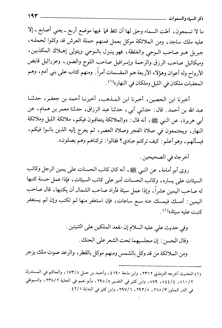 مَا لا تَسْمَعُونَ، أَطَّتِ السَّمَاءُ وَحُقَّ لَهَا أَنْ تَئِطَّ فَمَا فِيهَا مَوْضِعُ أَرْبَعٍ- يَعْنِي أَصَابِعَ- إِلا عَلَيْهِ مَلَكٌ سَاجِدٌ، وَمِنَ الْمَلائِكَةِ مُوَكَّلٌ بِعَمَلٍ فَمِنْهُمْ حَمَلَةُ الْعَرْشِ قَدْ وُكِّلُوا لِحَمْلِهِ، جِبْرِيلُ هُوَ صَاحِبُ الْوَحِي وَالْغِلْظَةِ، فَهُوَ يَنْزِلُ بِالْوَحْي وَيَتَوَلَّى إِهْلاكِ الْمُكَذِّبِينَ، وَمِيكَائِيلُ صَاحِبُ الرِّزْقِ وَالرَّحْمَةِ وَإِسْرَافِيلُ صَاحِبُ اللَّوْحِ وَالصُّورِ، وَعَزْرَائِيلُ قَابِضُ الأَرْوَاحِ وَلَهُ أَعْوَانٌ وَهَؤُلاءِ الأَرْبَعَةُ هُمُ الْمُقَسَّمَاتُ أَمْرًا. وَمِنْهُمْ كُتَّابٌ عَلَى بَنِي آَدَمَ، وَهُم الْمُعَقِّبَاتُ مَلَكَانِ فِي اللَّيْلِ وَمَلَكَانِ فِي النَّهَارِ» [1] .