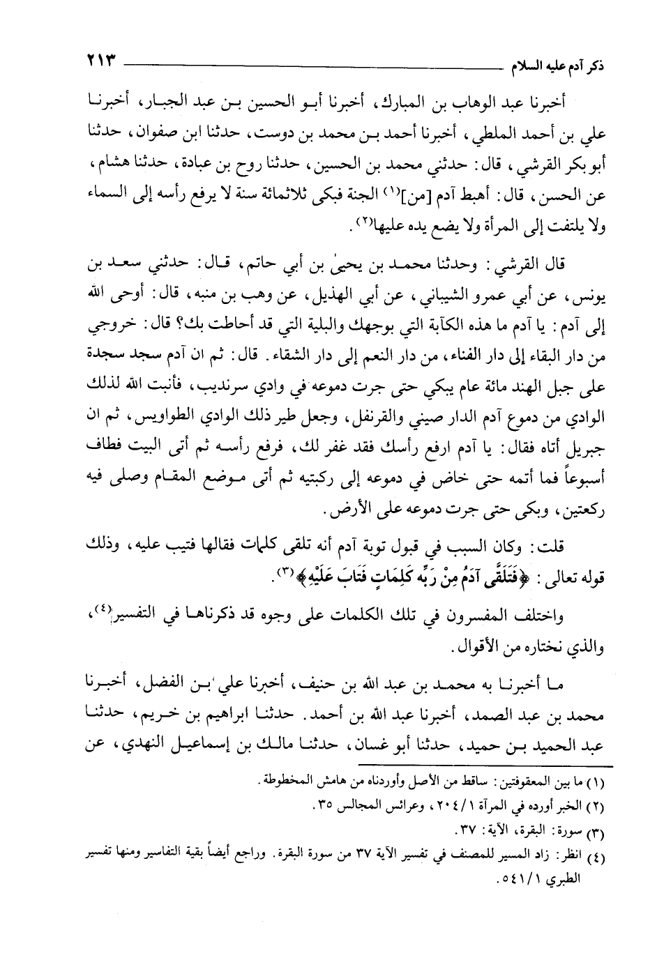 [4] انظر: زاد المسير للمصنف في تفسير الآية 37 من سورة البقرة. وراجع أيضا بقية التفاسير ومنها تفسير الطبري 1/ 541.