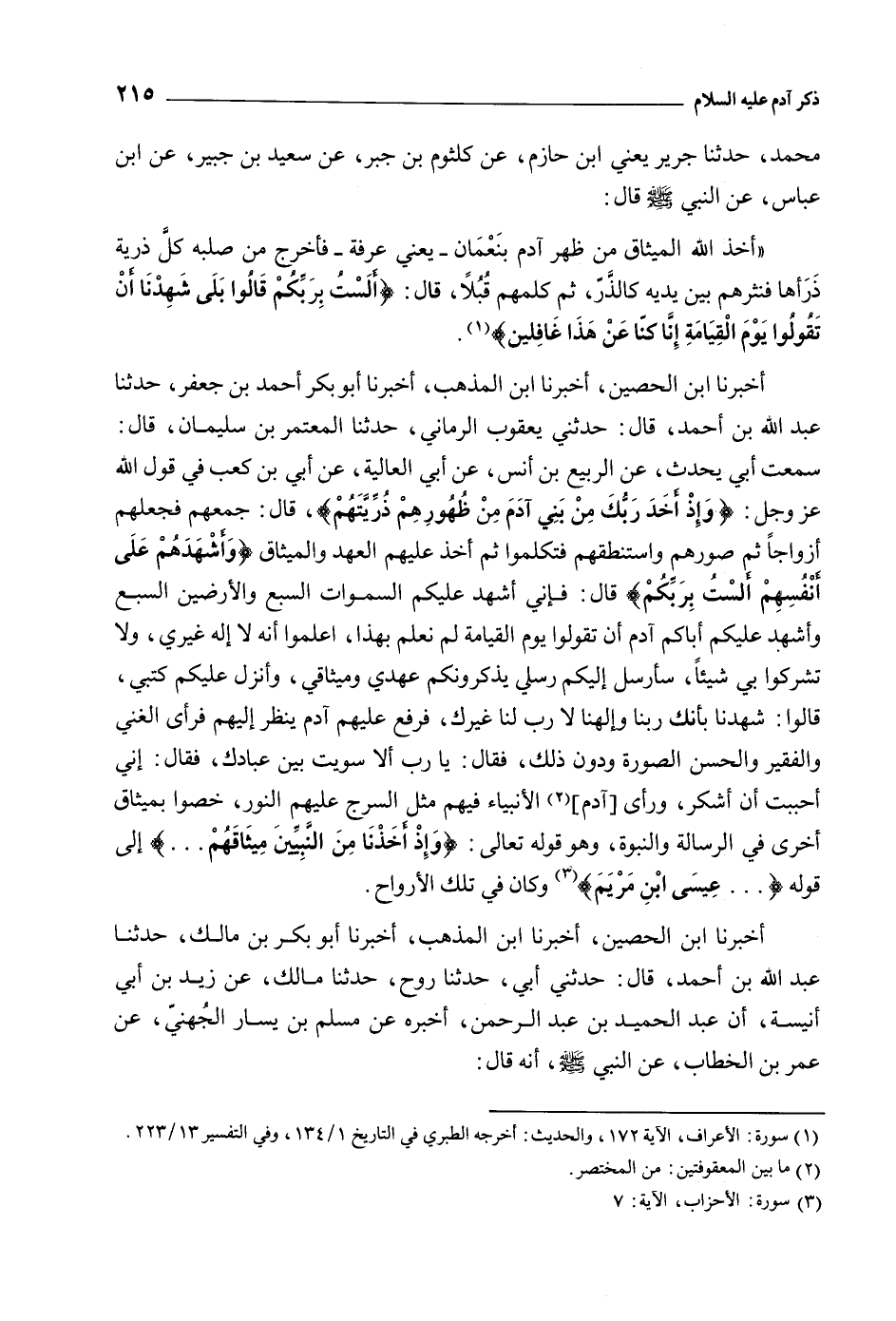 «أَخَذَ اللَّهُ الْمِيثَاقَ مِنْ ظَهْرِ آَدَمَ بِنُعْمَانَ- يَعْنِي عَرَفَةَ- فَأَخْرَجَ مِنْ صُلْبِهِ كُلَّ ذُرِّيَةٍ ذَرَأَهَا فَنَثَرَهُمْ بَيْنَ يَدَيْهِ كَالذُّرِّ، ثُمَّ كَلَّمَهُمْ قَبْلا، قَالَ: أَلَسْتُ بِرَبِّكُمْ قالُوا بَلى شَهِدْنا أَنْ تَقُولُوا يَوْمَ الْقِيامَةِ إِنَّا كُنَّا عَنْ هذا غافِلِينَ 7: 172 [1] . أَخْبَرَنَا ابْنُ الْحُصَيْنِ، أَخْبَرَنَا ابْنُ الْمُذْهِبِ، أَخْبَرَنَا أَبُو بَكْرٍ أَحْمَدُ بْنُ جَعْفَرٍ، حَدَّثَنَا عَبْدُ اللَّهِ بْنُ أَحْمَدَ، قَالَ: حَدَّثَنِي يَعْقُوبُ الرُّمَّانِيُّ، حَدَّثَنَا الْمُعْتَمِرُ بْنُ سُلَيْمَانَ، قَالَ:
