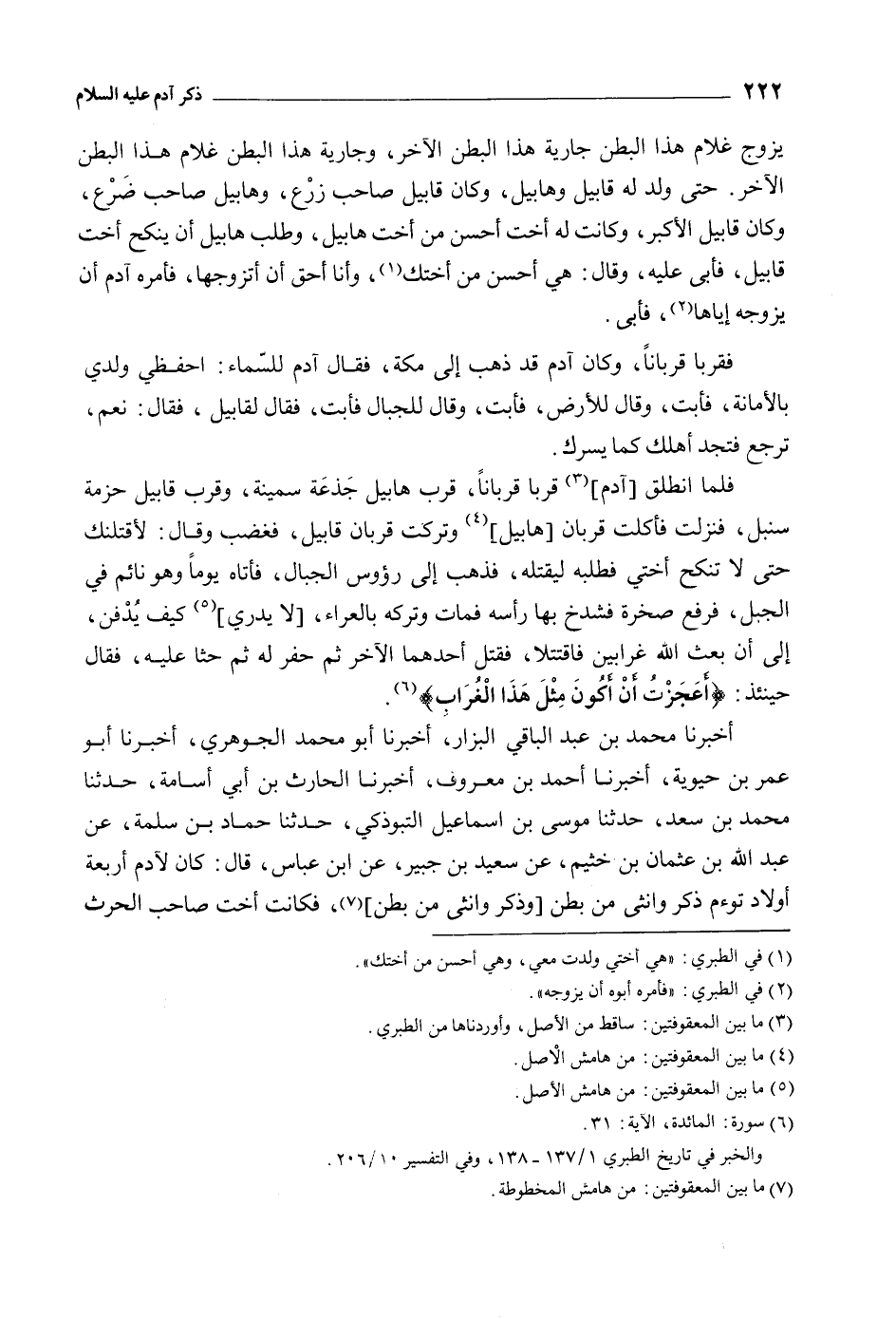 يزوج غلام هَذَا البطن جارية هَذَا البطن الآخر، وجارية هَذَا البطن غلام هَذَا البطن الآخر. حتى ولد لَهُ قابيل وهابيل، وَكَانَ قابيل صاحب زرع، وهابيل صاحب ضرع، وَكَانَ قابيل الأكبر، وكانت لَهُ أخت أَحْسَن من أخت هابيل، وطلب هابيل أَن ينكح أخت قابيل، فأبى عَلَيْهِ، وَقَالَ: هِيَ أَحْسَن من أختك [1] ، وأنا أحق أَن أتزوجها، فأمره آدَم أَن يزوجه إياها [2] ، فأبى.