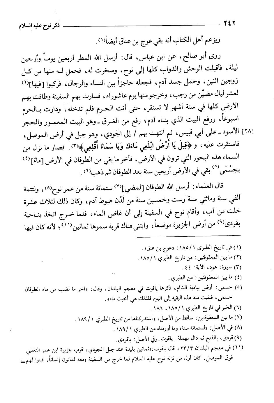 رَوَى أَبُو صَالِح، عَنِ ابْنِ عَبَّاسٍ، قَالَ: أرسل اللَّه المطر أربعين يوما وأربعين ليلة، فأقبلت الوحش والدواب كلها إِلَى نوح، وسخرت لَهُ، فحمل لَهُ منها من كل زوجين اثنين، وحمل جسد آدم، فجعله حاجزا بَيْنَ النِّسَاء والرجال، فركبوا [فِيهَا] [2] لعشر ليال مضين من رجب، وخرجوا منها يَوْم عاشوراء، فسارت بهم السفينة وطافت بهم الأَرْض كلها فِي ستة أشهر لا تستقر، حَتَّى أتت الحرم فلم تدخله، ودارت بالحرم أسبوعا، ورفع الْبَيْت الَّذِي بناه آدَم، رفع من الغرق- وَهُوَ الْبَيْت المعمور والحجر الأسود- عَلَى أَبِي قبيس، ثُمَّ انتهت بهم/ إِلَى الجودي، وَهُوَ جبل فِي أرض المَوْصِل، فاستقرت عَلَيْهِ، وقِيلَ يَا أَرْضُ ابْلَعِي ماءَكِ وَيا سَماءُ أَقْلِعِي 11: 44 [3] . فصار ما نزل من السماء هذه البحور الَّتِي ترون فِي الأَرْض، فآخر مَا بقي من الطوفان فِي الأَرْض [ماء] [4] بحسمى [5] بقى فِي الأَرْض أربعين سَنَة بَعْد الطوفان ثُمَّ ذهب [6] .