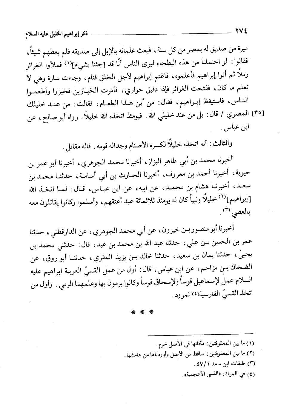 أَخْبَرَنَا مُحَمَّد بْن أَبِي طَاهِرٍ الْبَزَّازُ، أَخْبَرَنَا مُحَمَّدٌ الْجَوْهَرِيُّ، أَخْبَرَنَا أَبُو عُمَرَ بْنُ حيويه، أخبرنا أحمد بن معروف، أخبرنا الحارث بن أبي أسامة، حَدَّثَنَا مُحَمَّدُ بْنُ سَعْدٍ، أَخْبَرَنَا هِشَامُ بْنُ مُحَمَّد، عَنْ أَبِيهِ، عَنِ ابْنِ عَبَّاسٍ، قَالَ: لَمَّا اتَّخَذَ اللَّهُ [إِبْرَاهِيمَ] [2] خَلِيلا وَنَبِيًّا كَانَ له يومئذ ثلاثمائة عَبْدٍ أَعْتَقَهُمْ، وَأَسْلَمُوا وَكَانُوا يُقَاتِلُونَ مَعَهُ بِالْعِصِيِّ [3] .