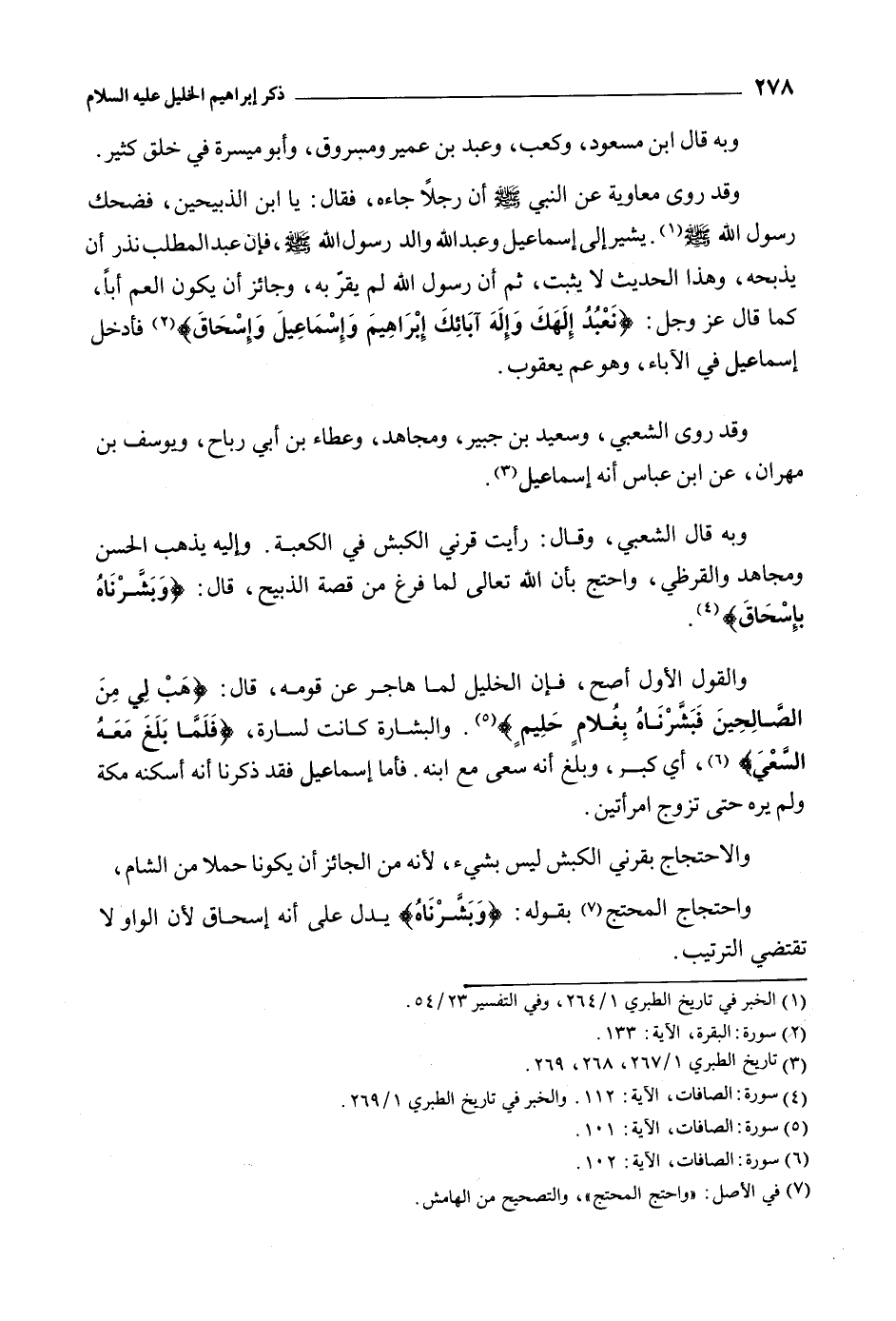 والاحتجاج بقرني الكبش لَيْسَ بشيء، لأنه من الجائز أَن يكونا حملا من الشام، واحتجاج المحتج [7] بقوله: وَبَشَّرْناهُ 37: 112 يدل عَلَى أَنَّهُ إِسْحَاق لأن الواو لا تقتضي الترتيب.
