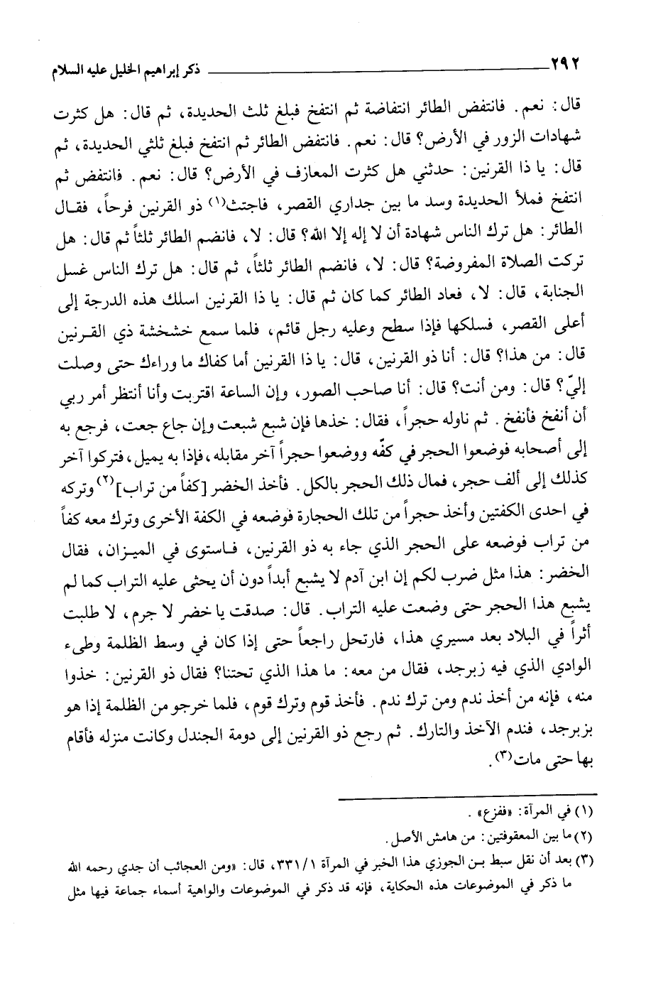 قَالَ: نَعَمْ. فَانْتَفَضَ الطَّائِرُ انْتِفَاضَةً ثُمَّ انْتَفَخَ فَبَلَغَ ثُلُثَ الْحَدِيدَةِ، ثُمَّ قَالَ: هَلْ كَثُرَتْ شَهَادَاتِ الزُّورِ فِي الأَرْض؟ قَالَ: نَعَمْ. فَانْتَفَضَ الطَّائِرُ ثُمَّ انْتَفَخَ فَبَلَغَ ثُلُثَي الْحَدِيدَةِ، ثُمَّ قَالَ: يَا ذَا الْقَرْنَيْنِ: حَدَّثَنِي هَلْ كَثُرَتِ الْمَعَازِفُ فِي الأَرْضِ؟ قَالَ: نَعَمْ. فَانْتَفَضَ ثُمَّ انتفخ فملأ الحديدة وسد ما بَيْنَ جِدَارَيِّ الْقَصْرِ، فَاجْتثَّ [1] ذُو الْقَرْنَيْنِ فرحًا، فَقَالَ الطَّائِرُ: هَلْ تَرَكَ النَّاسُ شَهَادَةَ أَنَّ لا إله إِلا اللَّهُ؟ قَالَ: لا، فَانْضَمَّ الطَّائِرُ ثُلُثًا ثُمَّ قَالَ: هَلْ تُرِكَتِ الصَّلاةُ الْمَفْرُوضَةُ؟ قَالَ: لا، فَانْضَمَّ الطَّائِرُ ثُلُثًا، ثُمَّ قَالَ: هَلْ تَرَكَ النَّاسُ غُسْلَ الْجَنَابَةِ، قَالَ: لا، فَعَاد الطَّائِرُ كَمَا كَانَ ثُمَّ قَالَ: يَا ذَا الْقَرْنَيْنِ اسْلُكْ هَذِهِ الدَّرَجَةَ إِلَى أَعْلَى الْقَصْرِ، فَسَلَكَهَا فَإِذَا سَطْحٌ وَعَلَيْهِ رَجُلٌ قَائِمٌ، فَلَمَّا سَمِعَ خَشْخَشَةَ ذِي الْقَرْنَيْنِ قَالَ: مَنْ هَذَا؟ قَالَ: أَنَا ذُو الْقَرْنَيْنِ، قَالَ: يَا ذَا القرنين أما كفاك ما وراءك حتى وصلت إِلَيَّ؟ قَالَ: وَمَنْ أَنْتَ؟ قَالَ: أَنَا صَاحِبُ الصُّورِ، وَإِنَّ السَّاعَةَ اقْتَرَبَتْ وَأَنَا أَنْتَظِرُ أَمْرَ رَبِّي أَنِ انْفُخْ فَأَنْفُخُ. ثُمَّ نَاوَلَهُ حَجَرًا، فَقَالَ: خُذْهَا فَإِنْ شَبِعَ شَبِعْتَ وَإِنْ جَاعَ جُعْتَ، فَرَجَعَ بِهِ إِلَى أَصْحَابِهِ فَوَضَعُوا الْحَجَرَ فِي كَفِّهِ وَوَضَعُوا حَجَرًا آَخَرَ مُقَابِلهُ، فَإِذَا بِهِ يَمِيلُ، فَتَرَكُوا آَخَرَ كَذَلِكَ إِلَى أَلْفِ حَجَرٍ، فَمَالَ ذَلِكَ الْحَجَرُ بِالْكُلِّ. فَأَخَذَ الْخَضْرُ [كفا من تراب] [2] وتركه فِي إِحْدَى الْكِفَّتَيْنِ وَأَخَذَ حَجَرًا مِنْ تِلْكَ الْحِجَارَةِ فَوَضَعَهُ فِي الْكِفَّةِ الأُخْرَى وَتَرَكَ مَعَهُ كَفًا مِنْ تُرَابٍ فَوَضَعَهُ عَلَى الْحَجَرِ الَّذِي جَاءَ بِهِ ذُو الْقَرْنَيْنِ، فَاسْتَوَى فِي الْمِيزَانِ، فَقَالَ الْخَضْرُ: هَذَا مَثَلٌ ضُرِبَ لَكُمْ إِنَّ ابْنَ آَدَمَ لا يَشْبَعُ أَبَدًا دُونَ أَنْ يُحْثَى عَلَيْهِ التُّرَابُ كَمَا لَمْ يَشْبَعْ هَذَا الحجر حَتَّى وَضَعْتُ عَلَيْهِ التُّرَابَ. قَالَ: صَدَقْتَ يَا خَضْرُ لا جَرَمَ، لا طَلَبْتُ أَثَرًا فِي الْبِلادِ بَعْدِ مَسِيرِي هَذَا، فَارْتَحَلَ رَاجِعًا حَتَّى إِذَا كَانَ فِي وَسْطِ الظُّلْمَةِ وَطِئَ الْوَادِي الَّذِي فِيهِ زَبَرْجَدُ، فَقَالَ مَنْ مَعَهُ: مَا هَذَا الَّذِي تَحْتَنَا؟ فَقَالَ ذُو الْقَرْنَيْنِ: خُذُوا مِنْهُ، فَإِنَّهُ مَنْ أَخَذَ نَدِمَ وَمَنْ تَرَكَ نَدِمَ. فَأَخَذَ قَوْمٌ وَتَرَكَ قَوْمٌ، فَلَمَّا خَرَجُوا مِنَ الظُّلْمَةِ إِذَا هُوَ بِزَبَرْجَدٍ، فَنَدِمَ الآَخِذُ وَالتَّارِكُ. ثُمَّ رَجَعَ ذُو الْقَرْنَيْنِ إِلَى دُومَةِ الْجَنْدَلِ وَكَانَتْ مَنْزِلُهُ فَأَقَامَ بِهَا حَتَّى مَاتَ [3] .