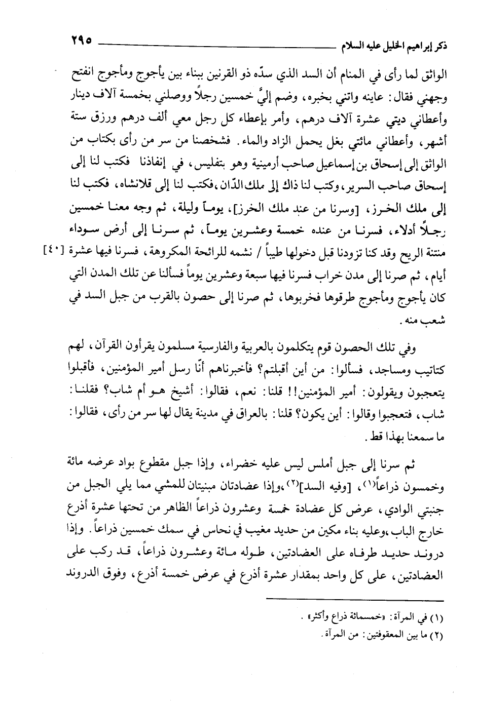 ثُمَّ سرنا إِلَى جبل أملس لَيْسَ عَلَيْهِ خضراء، وإذا جبل مقطوع بواد عرضه مائة وخمسون ذراعا [1] ، [وفيه السد] [2] ، وإذا عضادتان مبنيتان للمشي مِمَّا يلي الجبل من جنبتي الوادي، عرض كُل عضادة خمسة وعشرون ذراعا الظاهر من تحتها عشرة أذرع خارج الباب، وعليه بناء مكين من حديد مغيب فِي نحاس فِي سمك خمسين ذراعا. وإذا دروند حديد طرفاه عَلَى العضادتين، طوله مائة وعشرون ذراعا، قَدْ ركب عَلَى العضادتين، عَلَى كُل واحد بمقدار عشرة أذرع فِي عرض خمسة أذرع، وَفَوْقَ الدروند
