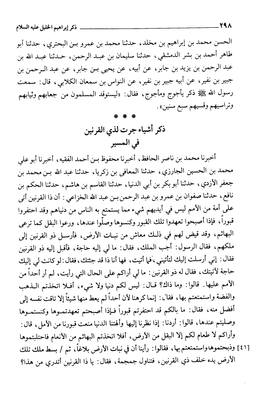أَخْبَرَنَا مُحَمَّد بْن ناصر الْحَافِظ، أَخْبَرَنَا محفوظ بْن أَحْمَد الفقيه، أَخْبَرَنَا أَبُو عَلِي مُحَمَّد بْن الحسين الجازري، حَدَّثَنَا المعافى بْن زَكَرِيَّا، حَدَّثَنَا عَبْد اللَّهِ بْن مُحَمَّد بْن جَعْفَر الأزدي، حَدَّثَنَا أَبُو بَكْر بْن أَبِي الدنيا، حَدَّثَنَا القاسم بْن هاشم، حدثنا الحكم بن نافع، حدثنا صفوان بْن عَمْرو بْن عَبْد الرَّحْمَنِ بْن عَبْد اللَّهِ الخزاعي: أَن ذا الْقَرْنَيْنِ أتى عَلَى أمة من الأمم لَيْسَ فِي أيديهم شَيْء مِمَّا يستمتع بِهِ النَّاس من دنياهم وَقَدِ احتفروا قبورا، فَإِذَا أصبحوا تعهدوا تلك القبور وكنسوها وصلوا عندها، ورعوا البقل كَمَا ترعى البهائم، وَقَدْ قيض لَهُمْ فِي ذَلِكَ معاش من نبات الأَرْض، فأرسل ذو الْقَرْنَيْنِ إِلَى ملكهم، فَقَالَ الرسول: أجب الْمَلِك، فَقَالَ: مَا لي إِلَيْهِ حاجة، فأقبل إِلَيْهِ ذو الْقَرْنَيْنِ فَقَالَ: إني أرسلت إليك لتأتيني، فَمَا أتيت، فها أنا ذا قَدْ جئتك، فَقَالَ: لو كانت لي إليك حاجة لأتيتك، فَقَالَ لَهُ ذو الْقَرْنَيْنِ: مَا لي أراكم عَلَى الحال الَّتِي رأيت، لَمْ أر أحدا من الأمم عَلَيْهَا. قَالُوا: وَمَا ذاك؟ قال: ليس لكم دنيا ولا شَيْء، أفلا اتخذتم الذهب والفضة واستمتعتم بها، فقال: إنما كرهنا لأن أحدا لم يعط منها شَيْئًا إلا تاقت نَفْسه إِلَى أفضل منه، فَقَالَ: مَا بالكم قَدِ احتفرتم قبورا فإذا أصبحتم تعهدتموها وكنستموها وصليتم عندها، قَالُوا: أردنا: إِذَا نظرنا إِلَيْهَا وألهتنا الدُّنْيَا منعت قبورنا من الأمل، قَالَ: