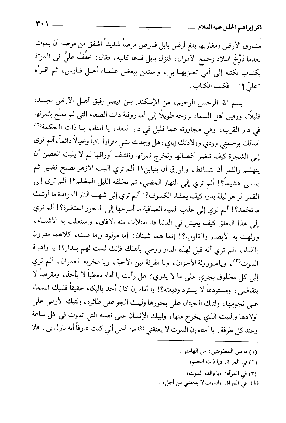 بسم اللَّه الرحمن الرحيم، من الإسكندر بْن قيصر رفيق أَهْل الأَرْض بجسده قليلا، ورفيق أَهْل السماء بروحه طويلا إِلَى أمه روقية ذَات الصفاء الَّتِي لَمْ تمتع بثمرتها فِي دار القرب، وَهِيَ مجاورته عما قليل فِي دار البعد، يا أمتاه، يا ذَات الحكمة [2] أسألك برحمتي وودي وولادتك إياي، هل وجدت لشيء قرارا باقيا وخيالا دائما، ألم تري إلى الشجرة كيف تنضر أغصانها وتخرج ثمرتها وتلتف أوراقها ثُمَّ لا يلبث الغصن أَن يتهشم والثمر أَن يتساقط، والورق أَن يتباين؟! ألم تري النبت الأزهر يصبح نضيرا ثُمَّ يمسي هشيما؟! ألم تري إِلَى النهار المضيء ثُمَّ يخلفه الليل المظلم؟! ألم تري إِلَى القمر الزاهر ليلة بدره كَيْفَ يغشاه الكسوف؟! ألم تري إِلَى شهب النار الموقدة مَا أوشك مَا تخمد؟! ألم تري إِلَى عذب المياه الصافية مَا أسرعها إِلَى البحور المتغيرة؟! ألم تري إِلَى هَذَا الخلق كَيْفَ يعيش فِي الدُّنْيَا قَدِ امتلأت منه الآفاق، واستعلت بِهِ الأشياء، وولهت بِهِ الأبصار والقلوب؟! إِنَّمَا هما شيئان: إِمَّا مولود وإما ميت، كلاهما مقرون بالفناء، ألم تري أَنَّهُ قيل لهذه الدار روحي بأهلك فإنك لست لَهُمْ بدار؟! يا واهبة الْمَوْت [3] ، ويا موروثة الأحزان، ويا مفرقة بَيْنَ الأحبة، ويا مخربة العمران، ألم تري إِلَى كُل مخلوق يجري عَلَى مَا لا يدري؟ هل رأيت يا أماه معطيا لا يأخذ، ومقرضا لا يتقاضى، ومستودعا لا يسترد وديعته؟! يا أماه إِن كَانَ أحد بالبكاء حقيقا فلتبك السماء عَلَى نجومها، ولتبك الحيتان عَلَى بحورها وليبك الجو عَلَى طائره، ولتبك الأَرْض عَلَى أولادها والنبت الَّذِي يخرج منها، وليبك الإِنْسَان عَلَى نَفْسه الَّتِي تموت فِي كُل ساعة وعند كُل طرفة. يا أمتاه إِن الْمَوْت لا يعتقني [4] من أجل أني كنت عارفا أَنَّهُ نازل بي، فلا