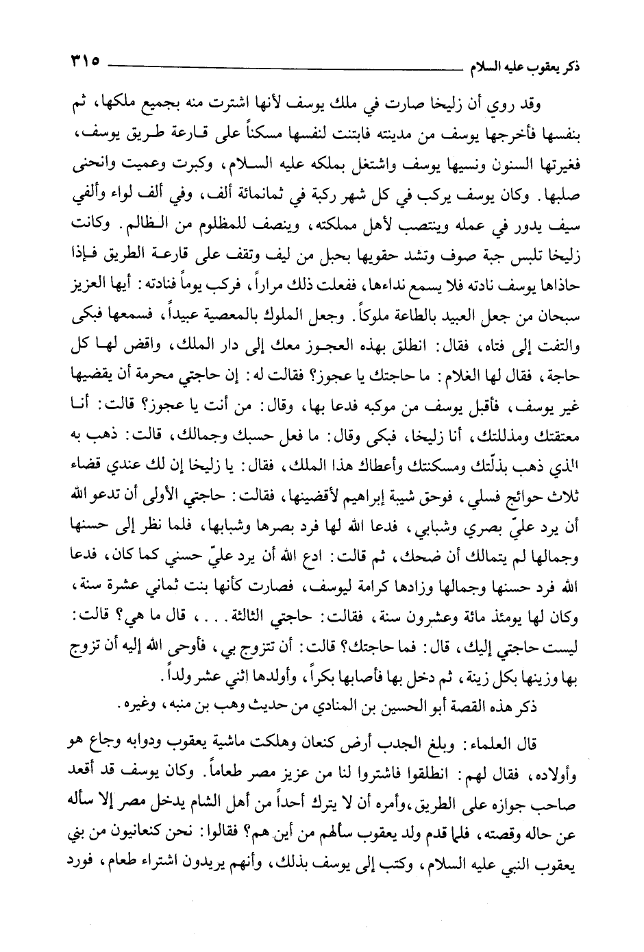 وَقَدْ روي أَن زليخا صارت فِي ملك يُوسُف لأنها اشترت منه بجميع ملكها، ثُمَّ بنفسها فأخرجها يُوسُف من مدينته فابتنت لنفسها مسكنا عَلَى قارعة طريق يُوسُف، فغيرتها السنون ونسيها يُوسُف واشتغل بملكه عَلَيْهِ السَّلام، وكبرت وعميت وانحنى صلبها. وَكَانَ يُوسُف يركب فِي كل شهر ركبة في ثمانمائة ألف، وَفِي ألف لواء وألفي سَيْف يدور فِي عمله وينتصب لأهل مملكته، وينصف للمظلوم من الظَّالِم. وكانت زليخا تلبس جبة صوف وتشد حقويها بحبل من ليف وتقف عَلَى قارعة الطريق فَإِذَا حاذاها يُوسُف نادته فلا يسمع نداءها، ففعلت ذَلِكَ مرارا، فركب يوما فنادته: أيها الْعَزِيز سبحان من جعل العبيد بالطاعة ملوكا. وجعل الملوك بالمعصية عبيدا، فسمعها فبكى والتفت إِلَى فتاه، فَقَالَ: انطلق بهذا العجوز معك إِلَى دار الْمَلِك، واقض لَهَا كُل حاجة، فَقَالَ لَهَا الغلام: مَا حاجتك يا عجوز؟ فَقَالَتْ لَهُ: إِن حاجتي محرمة أن يقضيها غَيْر يُوسُف، فأقبل يُوسُف من موكبه فدعا بها، وَقَالَ: من أَنْتَ يا عجوز؟ قَالَتْ: أنا معتقتك ومذللتك، أنا زليخا، فبكى وَقَالَ: مَا فعل حسبك وجمالك، قَالَتْ: ذهب بِهِ الَّذِي ذهب بذلتك ومسكنتك وأعطاك هَذَا الْمَلِك، فَقَالَ: يا زليخا إِن لَكَ عندي قضاء ثلاث حوائج فسلي، فو حقّ شيبة إِبْرَاهِيم لأقضينها، فَقَالَتْ: حاجتي الأولى أَن تدعو اللَّه أَن يرد عَلِي بصري وشبابي، فدعا اللَّه لَهَا فرد بصرها وشبابها، فلما نظر إِلَى حسنها وجمالها لَمْ يتمالك أَن ضحك، ثُمّ قَالَتْ: ادع اللَّه أَن يرد عَلِي حسني كَمَا كَانَ، فدعا اللَّه فرد حسنها وجمالها وزادها كرامة ليوسف، فصارت كأنها بنت ثماني عشرة سَنَة، وَكَانَ لَهَا يَوْمَئِذٍ مائة وعشرون سَنَة، فَقَالَتْ: حاجتي الثالثة ... قَالَ مَا هِيَ؟ قَالَتْ: