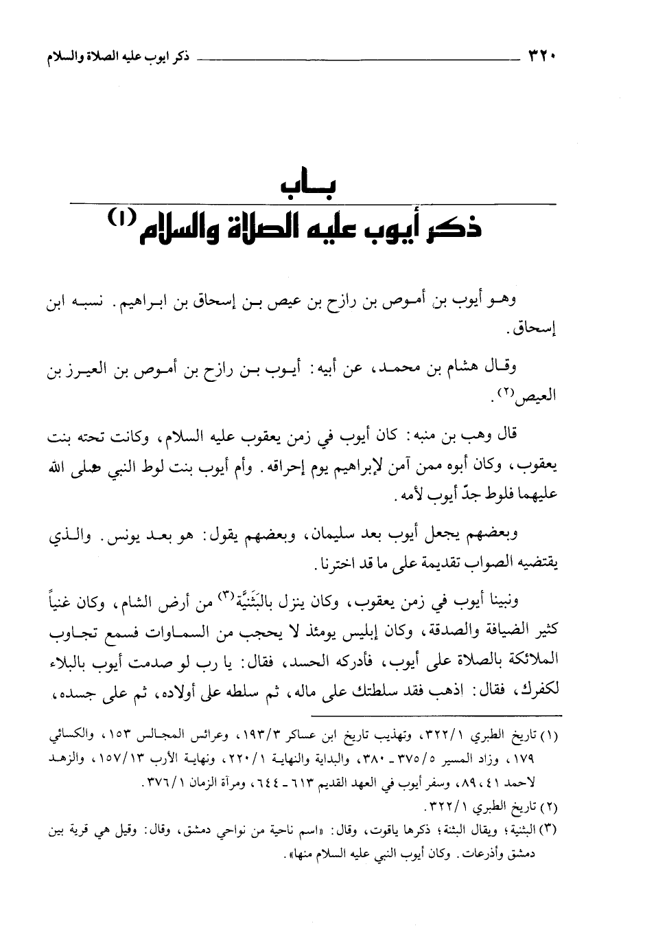 [1] تاريخ الطبري 1/ 322، وتهذيب تاريخ ابن عساكر 3/ 193، وعرائس المجالس 153، والكسائي 179، وزاد المسير 5/ 375- 380، والبداية والنهاية 1/ 220، ونهاية الأرب 13/ 157، والزهد لأحمد 41، 89، وسفر أيوب في العهد القديم 613- 644، ومرآة الزمان 1/ 376.