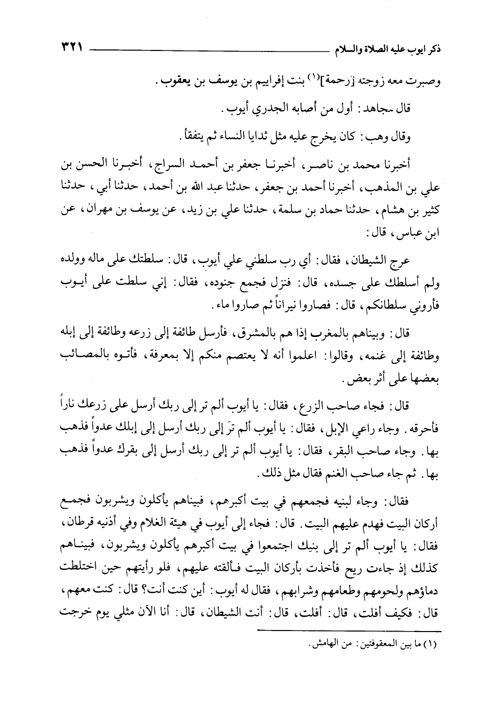 عَرَجَ الشَّيْطَانُ، فَقَالَ: أَيْ رَبِّ سَلِّطْنِي عَلَى أَيُّوبَ، قَالَ: سَلَّطْتُكَ عَلَى مَالِهِ وَوَلَدِهِ وَلَمْ أُسَلِّطْكَ عَلَى جَسَدِهِ، قَالَ: فَنَزَلَ فَجَمَعَ جُنُودَهُ، فَقَالَ: إِنِّي سُلِّطْتُ عَلَى أَيُّوبَ فَأَرُونِي سُلْطَانَكُمْ، قَالَ: فَصَارُوا نِيرَانًا ثُمَّ صاروا ماء.