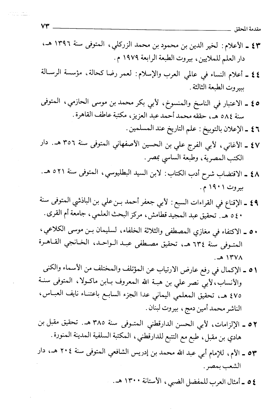 51- الإكمال في رفع عارض الارتياب عن المؤتلف والمختلف من الأسماء والكنى والأنساب، لأبي نصر علي بن هبة الله المعروف بابن ماكولا، المتوفى سنة 475 هـ، تحقيق المعلمي اليماني عدا الجزء السابع باعتناء نايف العباس، الناشر محمد أمين دمج، بيروت لبنان.