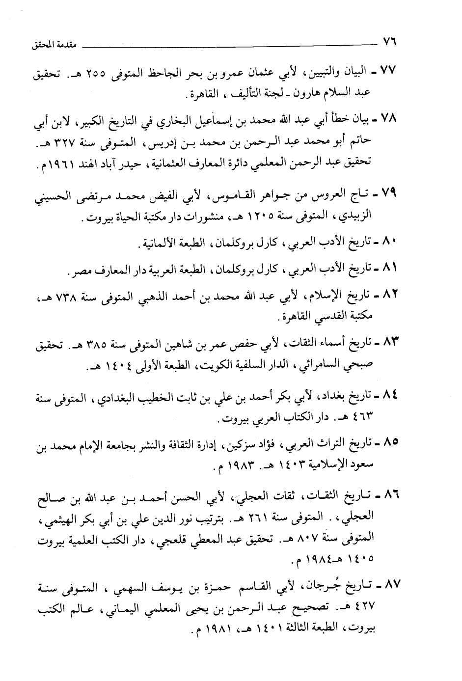 83- تاريخ أسماء الثقات، لأبي حفص عمر بن شاهين المتوفى سنة 385 هـ. تحقيق صبحي السامرائي، الدار السلفية الكويت، الطبعة الأولى 1404 هـ.