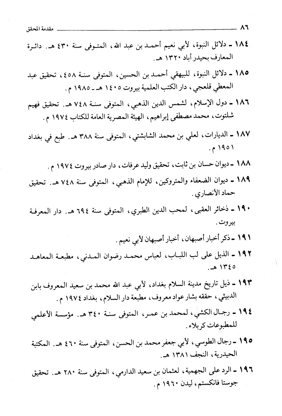 186- دول الإسلام، لشمس الدين الذهبي، المتوفى سنة 748 هـ. تحقيق فهيم شلتوت، محمد مصطفى إبراهيم، الهيئة المصرية العامة للكتاب 1974 م.
