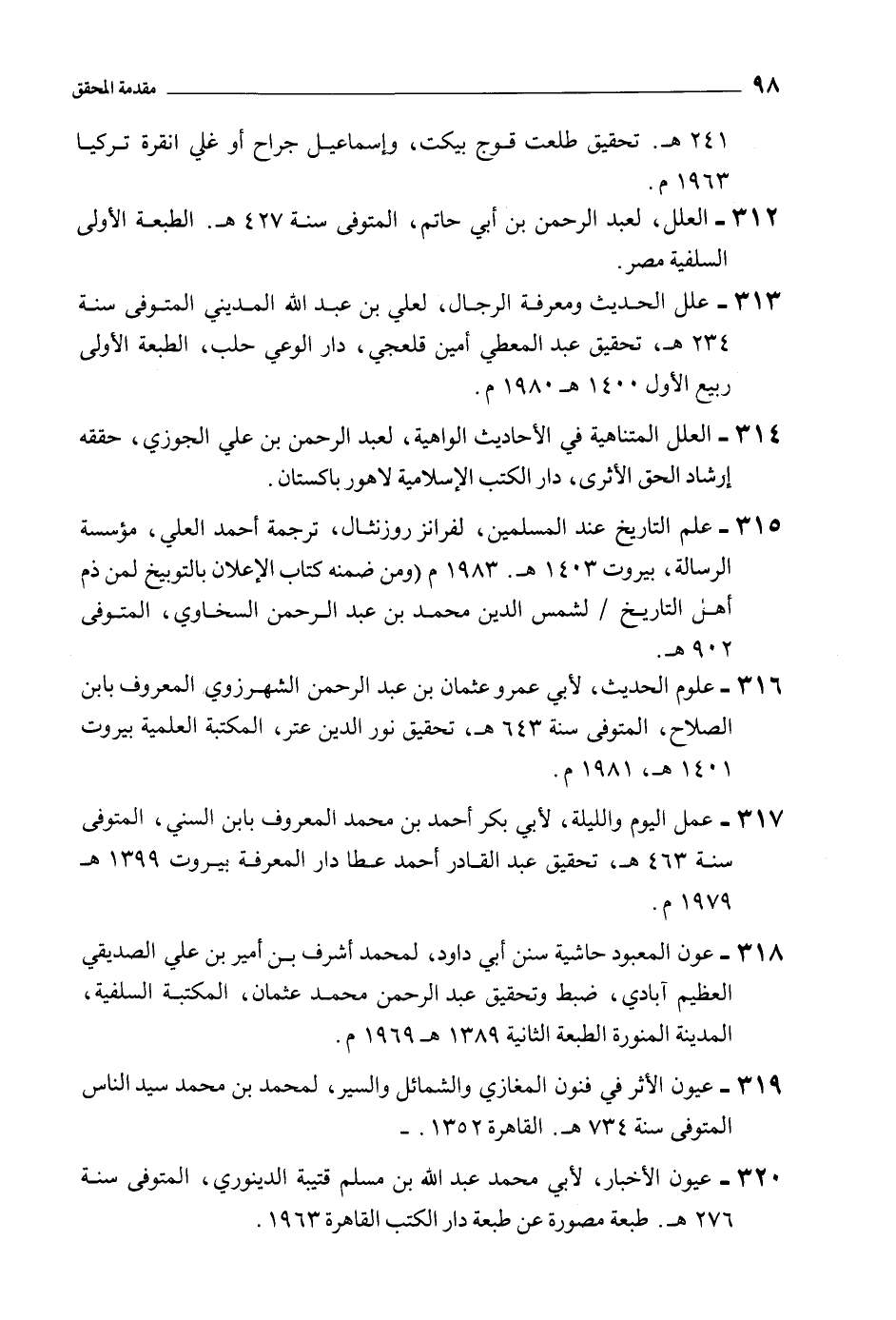 316- علوم الحديث، لأبي عمرو عثمان بن عبد الرحمن الشهرزوريّ المعروف بابن الصلاح، المتوفى سنة 643 هـ، تحقيق نور الدين عتر، المكتبة العلمية بيروت 1401 هـ، 1981 م.