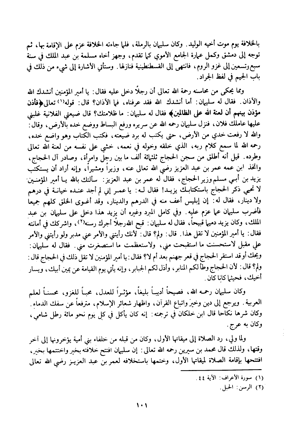 ومما يحكى من محاسنه رحمة الله تعالى أن رجلا دخل عليه فقال: يا أمير المؤمنين أنشدك الله والآذان. فقال له سليمان: أما أنشدك الله فقد عرفناه، فما الآذان؟ قال: قوله «1» تعالى فَأَذَّنَ مُؤَذِّنٌ بَيْنَهُمْ أَنْ لَعْنَةُ اللَّهِ عَلَى الظَّالِمِينَ