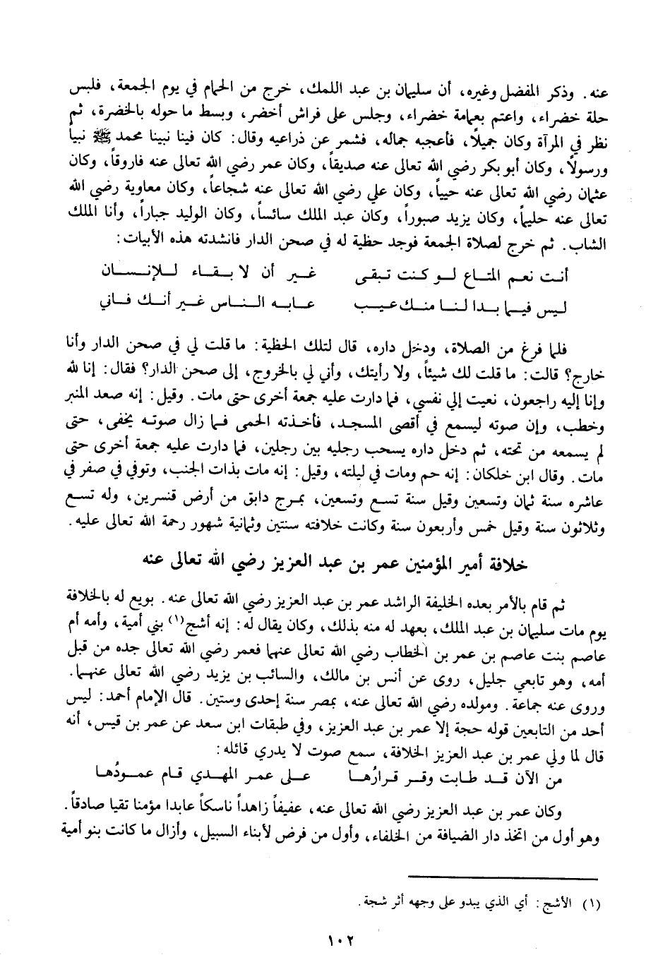ثم قام بالأمر بعده الخليفة الراشد عمر بن عبد العزيز رضي الله تعالى عنه. بويع له بالخلافة يوم مات سليمان بن عبد الملك، بعهد له منه بذلك، وكان يقال له: إنه أشج «1» بني أمية، وأمه أم عاصم بنت عاصم بن عمر بن الخطاب رضي الله تعالى عنهما فعمر رضي الله تعالى جده من قبل أمه، وهو تابعي جليل، روى عن أنس بن مالك، والسائب بن يزيد رضي الله تعالى عنهما.
