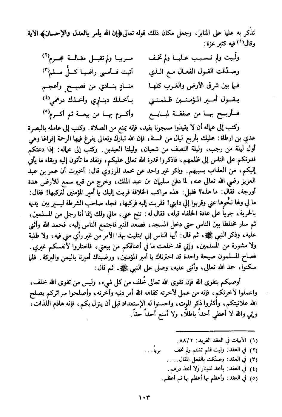 أوصيكم بتقوى الله فإن تقوى الله تعالى خلف من كل شيء، وليس من تقوى الله خلف، واعملوا لآخرتكم، فإنه من عمل لآخرته كفاهه الله أمر دنيه وآخرته، وأصلحوا سرائركم يصلح الله علانيتكم، وأكثروا ذكر الموت، واحسنوا له الإستعداد قبل أن ينزل بكم، فإنه هاذم اللذات، وإني والله لا أعطي أحدا باطلا، ولا أمنع أحدا حقا.