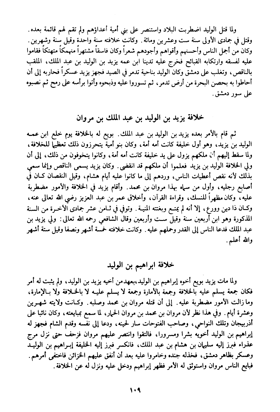 ثم قام بالأمر بعده يزيد بن الوليد بن عبد الملك. بويع له بالخلافة يوم خلع ابن عمه الوليد بن يزيد، وهو أول خليفة كانت أمه أمة، وكان بنو أمية يتحرزون ذلك تعظيما للخلافة، ولما سقط إليهم أن ملكهم يزول على يد خليفة كانت أمه أمة، وكانوا يتخوفون من ذلك، إلى أن ولي الخلافة الوليد بن يزيد فعلموا أن ملكهم قد انقضى. وكان يزيد يسمى الناقص وإنما سمي بذلك لأنه نقص أعطيات الناس، وردهم إلى ما كانوا عليه أيام هشام، وقيل النقصان كان في أصابع رجليه، وأول من سماه بهذا مروان بن محمد. وأقام يزيد في الخلافة والأمور مضطربة عليه، وكان مظهرا للنسك، وقراءة القرآن، وأخلاق عمر بن عبد العزيز رضي الله تعالى عنه، وكان ذا دين وورع، إلا أنه لم يمتع وبغتته المنية. وتوفي في ثامن عشر جمادى الآخرة من السنة المذكورة وهو ابن أربعين سنة وقيل ست وأربعين وقال الشافعي رحمه الله تعالى: ولي يزيد بن عبد الملك فدعا الناس إلى القدر وحملهم عليه. وكانت خلافته خمسة أشهر ونصفا وقيل ستة أشهر والله أعلم.