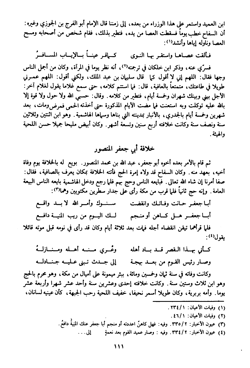 أن السفاح خطب يوما فسقطت العصا من يده، فتطير بذلك، فقام شخص من أصحابه ومسح العصا وناوله إياها وأنشد «1» :