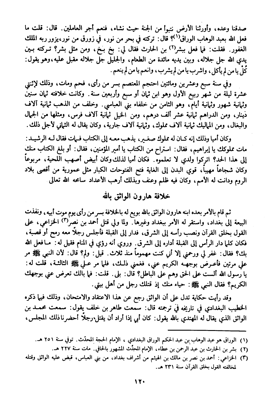 ثم قام بالأمر بعده ابنه هارون الواثق بالله بويع له بالخلافة بسر من رأى يوم موت أبيه، ونفذت البيعة إلى بغداد، واستقر له الأمر ببغداد وغيرها. ولما ولي قتل أحمد بن نصر «3» الخزاعي، على القول بخلق القرآن ونصب رأسه إلى الشرق، فدار إلى القبلة فأجلس رجلا معه رمح أو قصبة، فكان كلما دار الرأس إلى القبلة أداره إلى الشرق. وروي أنه رؤي في المنام فقيل له: ما فعل الله بك؟ فقال: غفر لي ورحمني إلا أني كنت مهموما منذ ثلاث. قيل: ولم؟ قال: لأن النبي صلى الله عليه وسلم مر علي مرتين فأعرض بوجهه الكريم عني، فغمني ذلك، فلما مر علي صلى الله عليه وسلم الثالثة، قلت له: