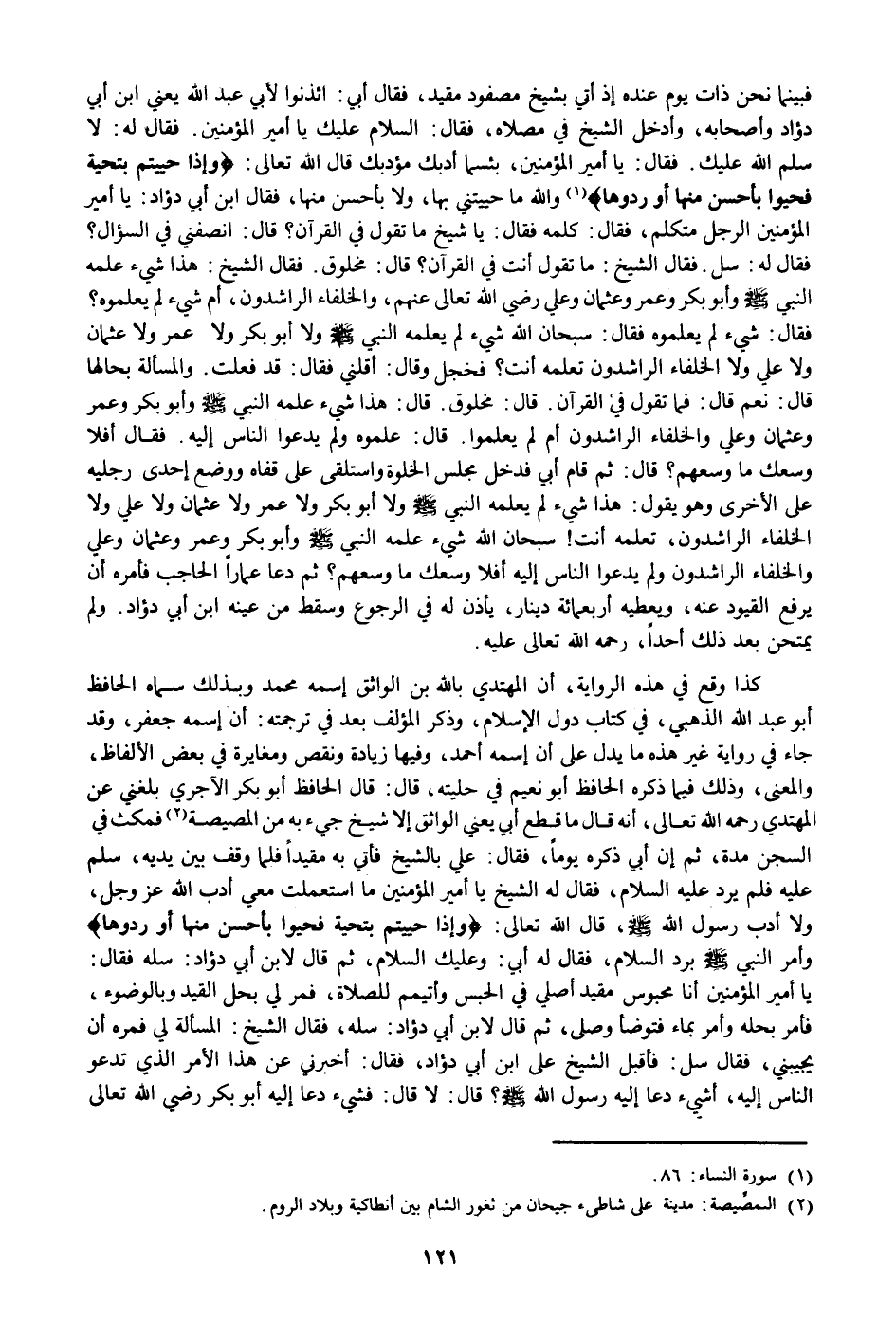 «1» والله ما حييتني بها، ولا بأحسن منها، فقال ابن أبي دؤاد: يا أمير المؤمنين الرجل متكلم، فقال: كلمه فقال: يا شيخ ما تقول في القرآن؟ قال: انصفني في السؤال؟